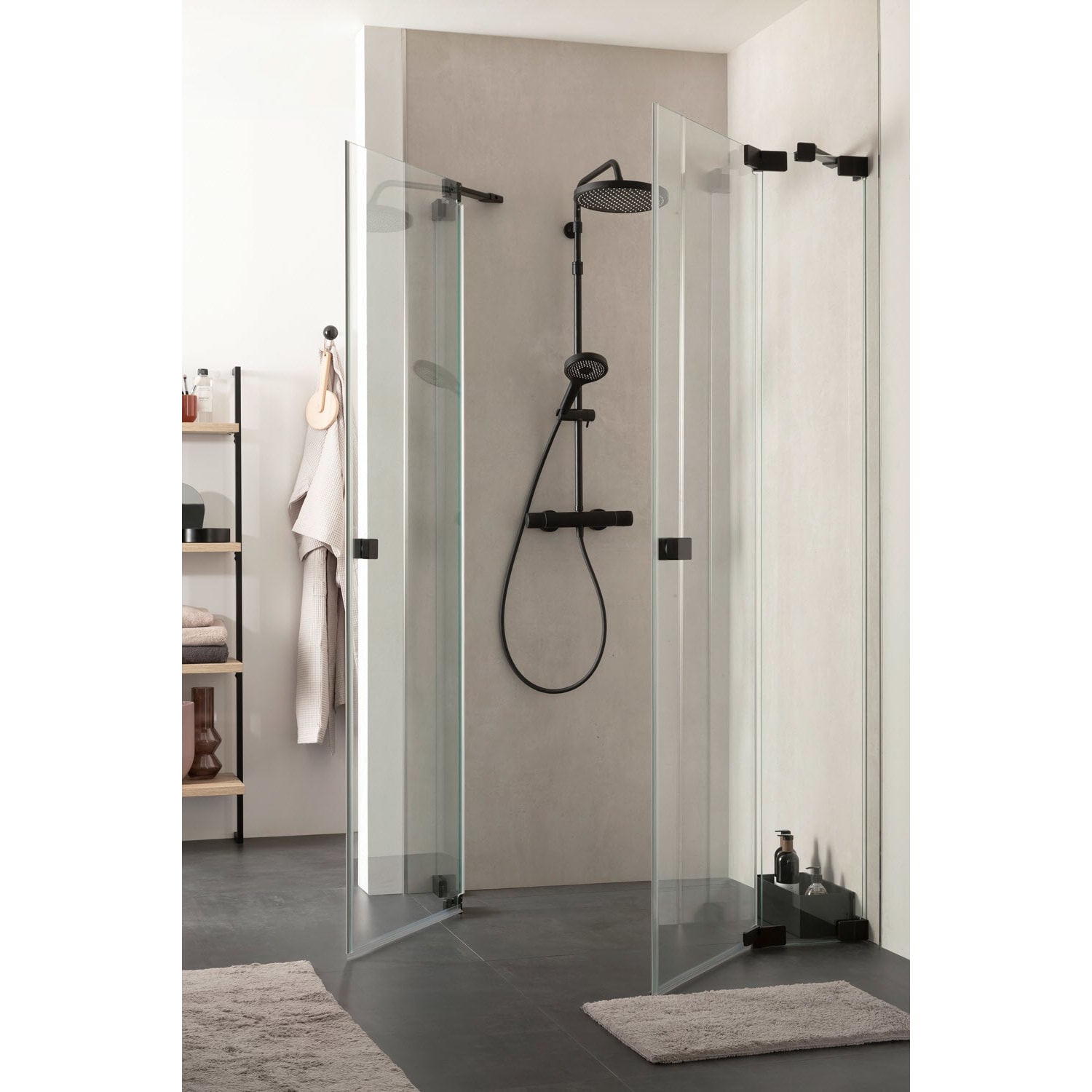 Die Eckdusche mit zwei Drehtüren und zwei Festteilen der Serie FIT aus der SCHÖNER WOHNEN-Kollektion kann bodeneben und barrierefrei montiert werden.