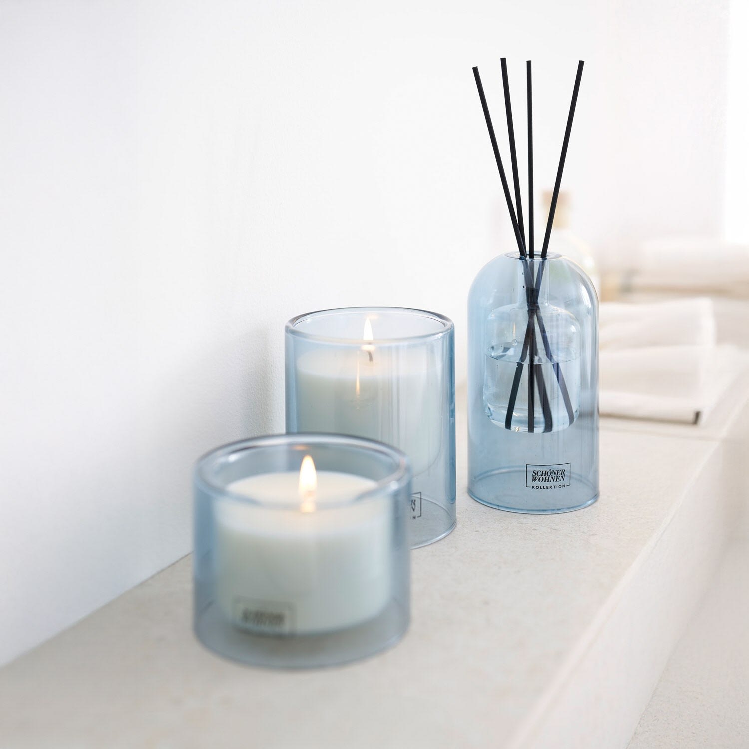 - Kühles blaues Kerzen-Glas mit weißer Duftkerze