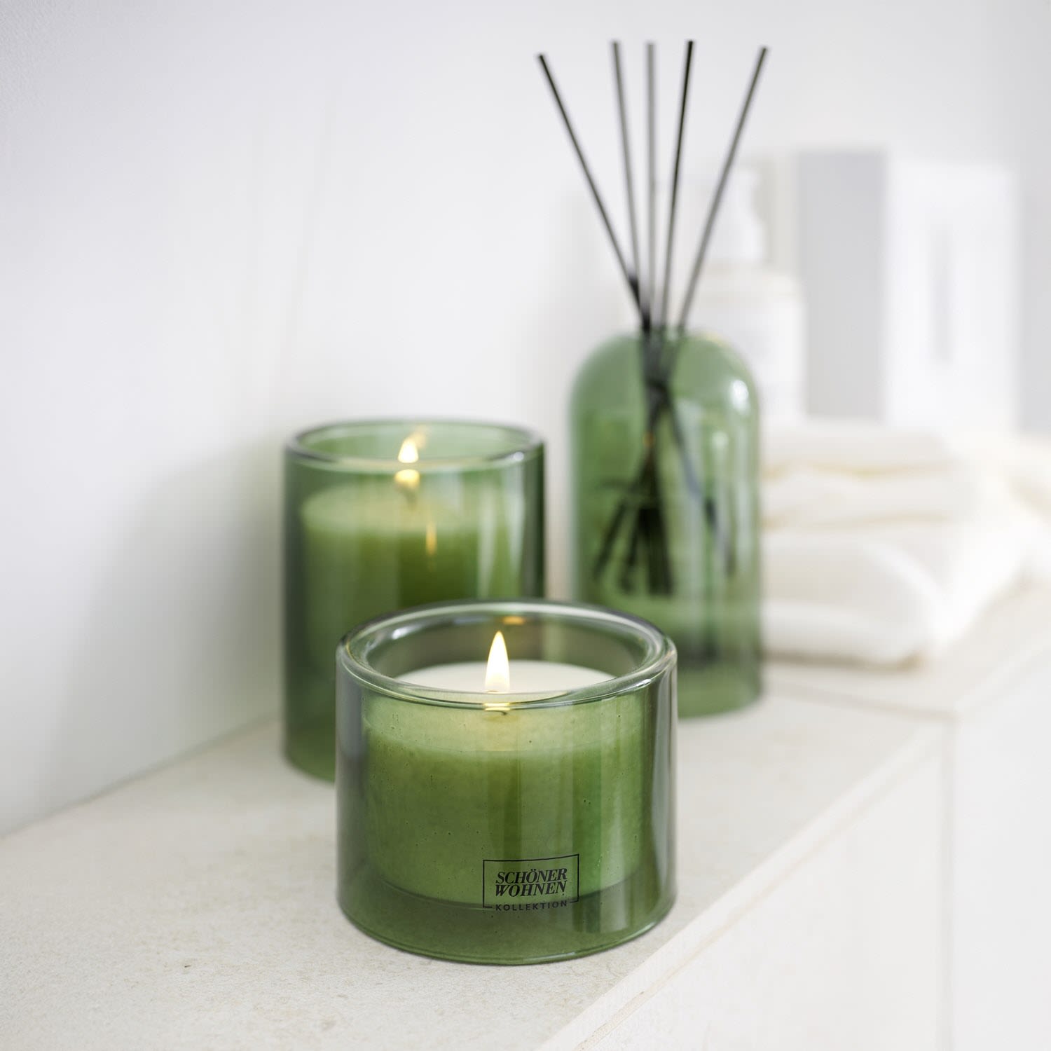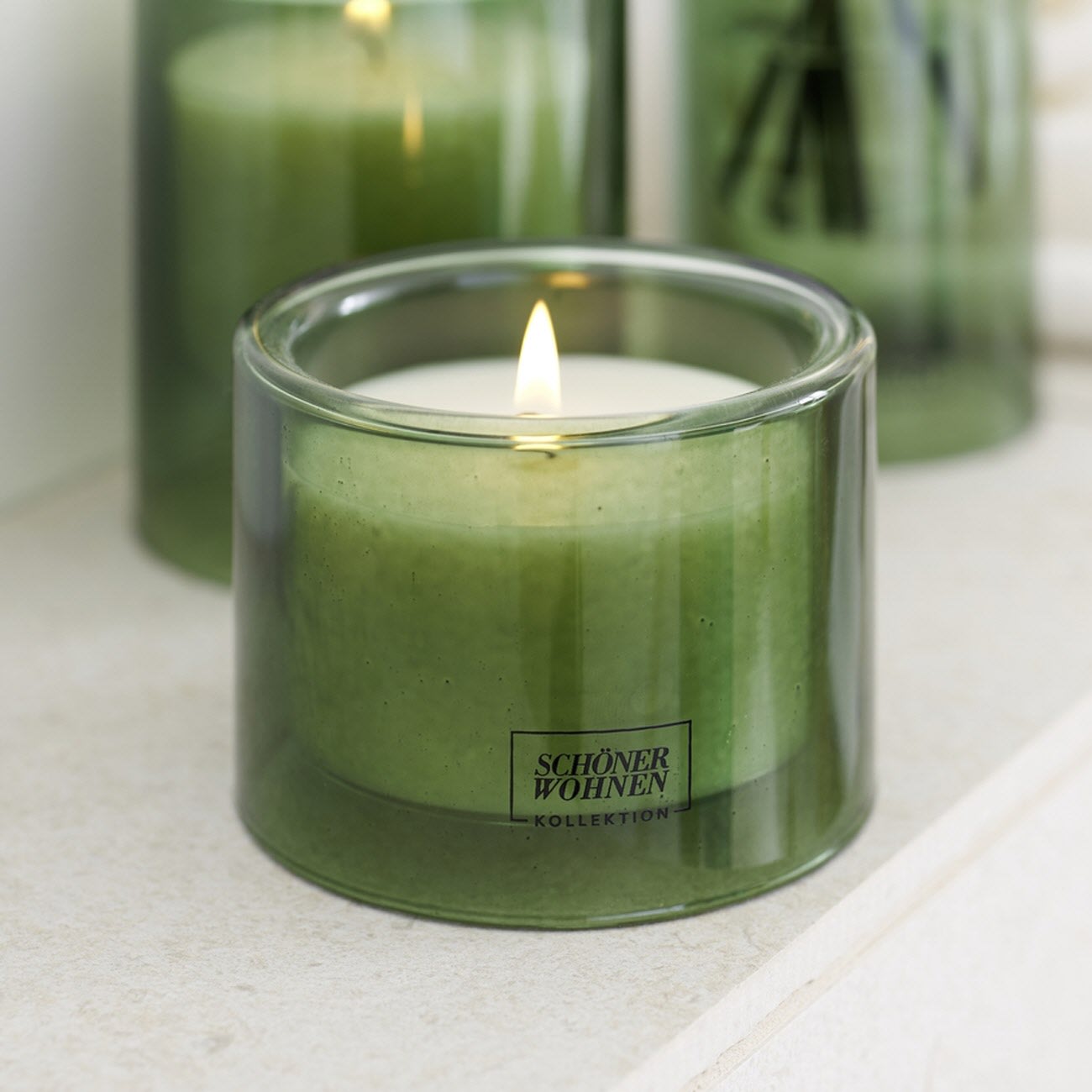 - Kerzenglas in harmonischem Moosgrün mit weißer Kerze