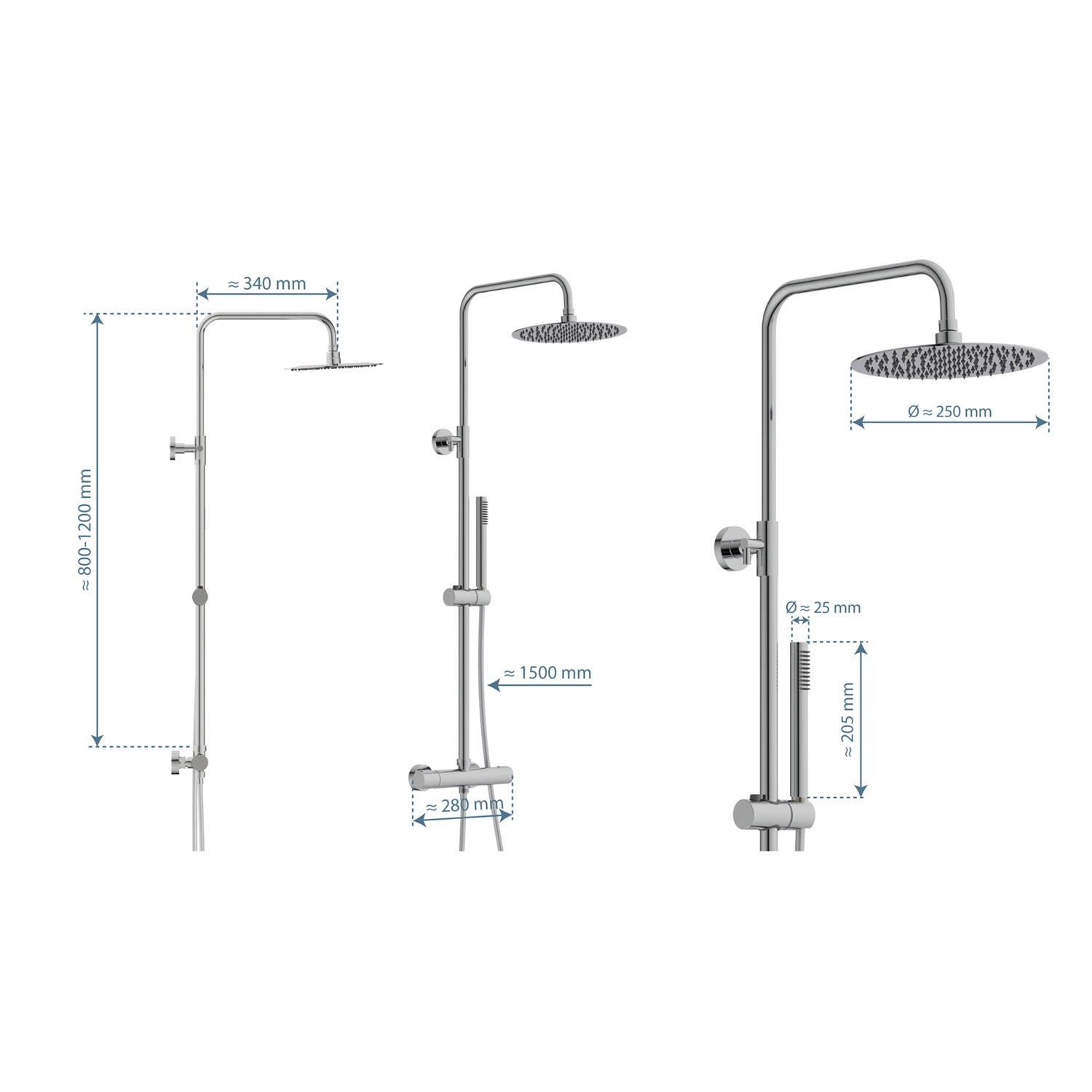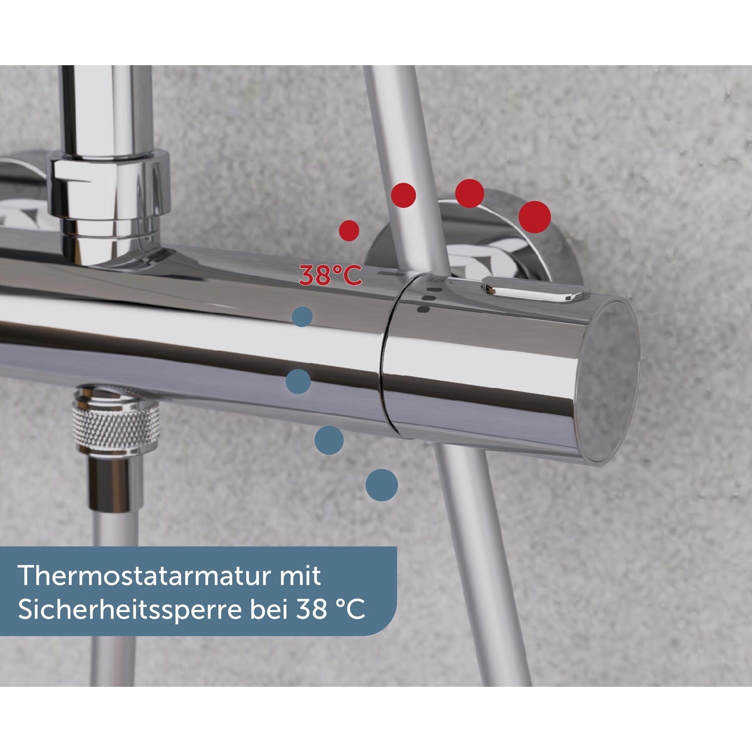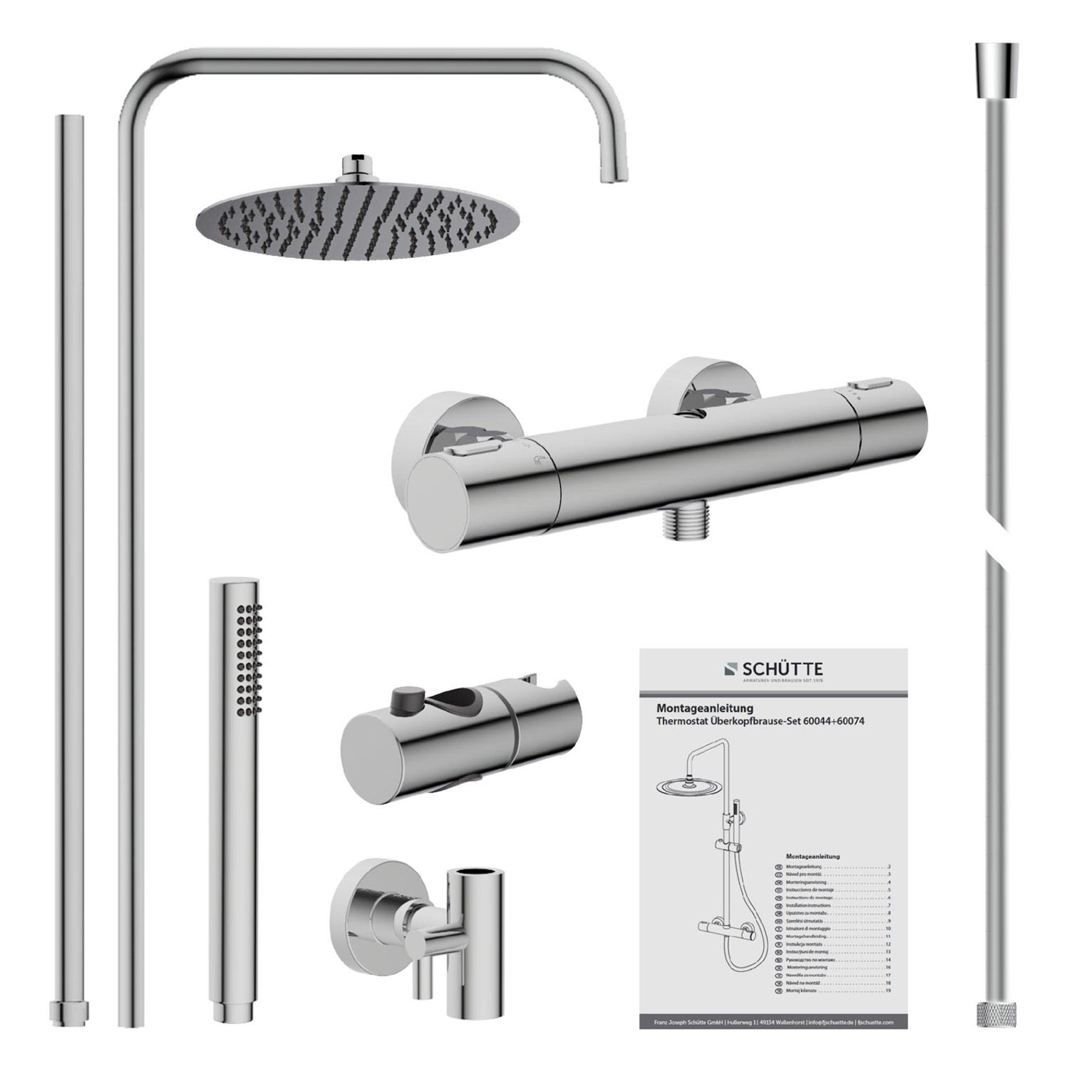 - Lieferumfang: 1 x Thermostatarmatur, 1 x Brausestange, 1 x Brauseschlauch, 1 x Kopfbrause, 1 x Handbrause, 1 x Brausehalter, 1 x Umsteller