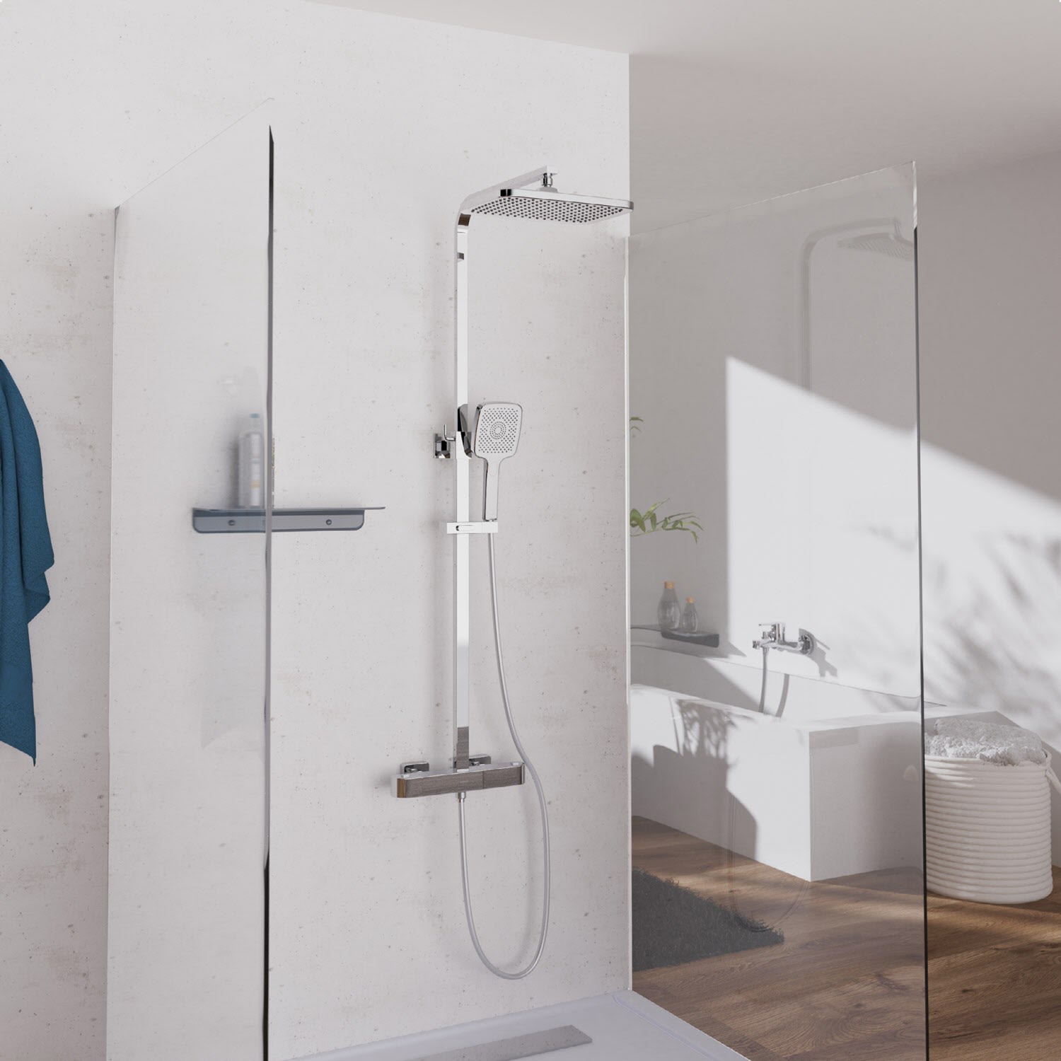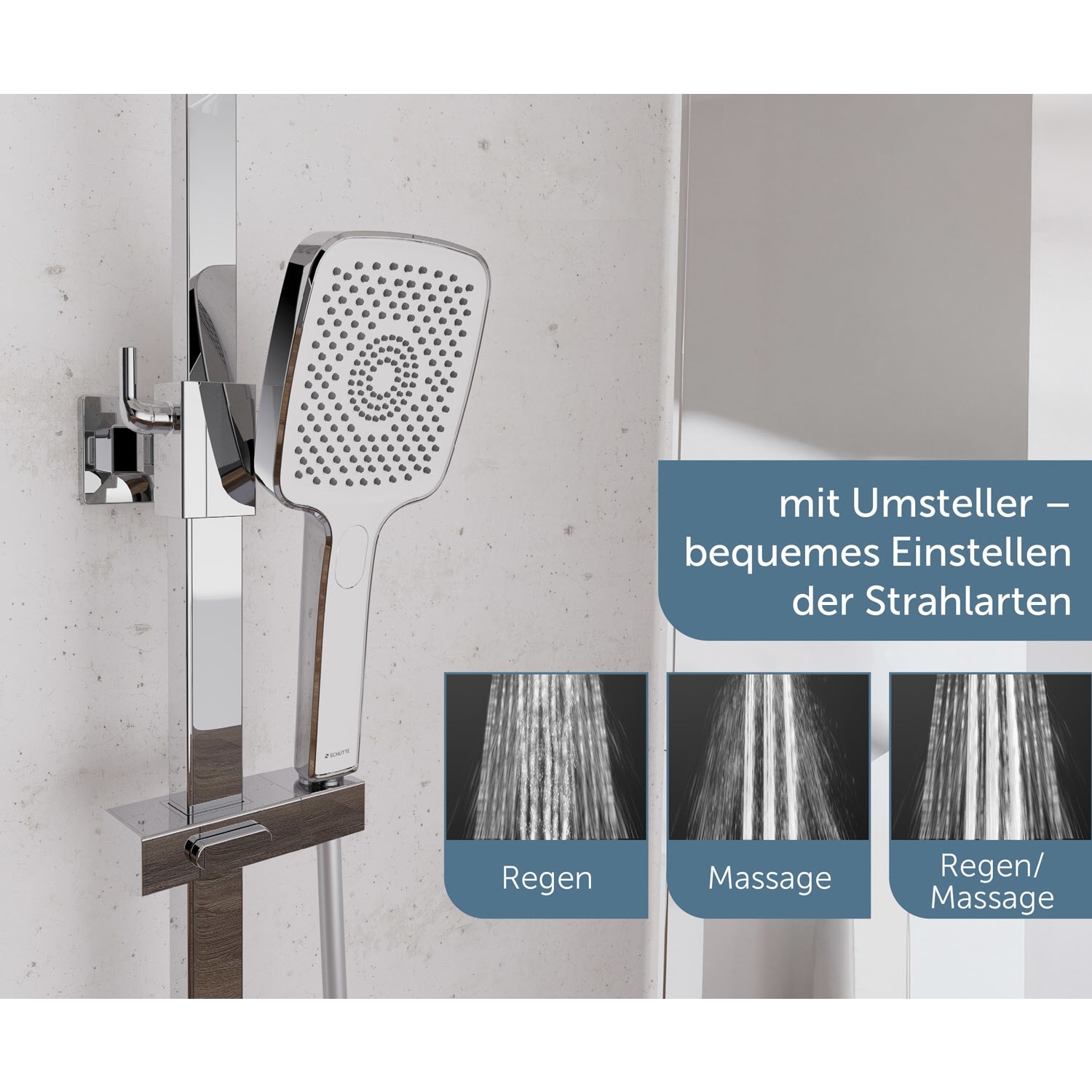 Duschstange mit integriertem Umsteller für den einfachen Wechsel zwischen Regendusche und Handbrause. Die Wellness Handbrause verfügt über drei Strahlarten, individuell einstellbar je nach Duschtyp. Der Brausekopf mit Antikalk-Noppen für die einfache Entfernung von Kalkrückständen. Brauseschlauch mit Verdrehschutz: der drehbare Anschluss sorgt dafür, dass sich der Brauseschlauch nicht verdreht – für reibungslosen Duschkomfort, mehr Flexibilität und eine längere Lebensdauer des Schlauchs.