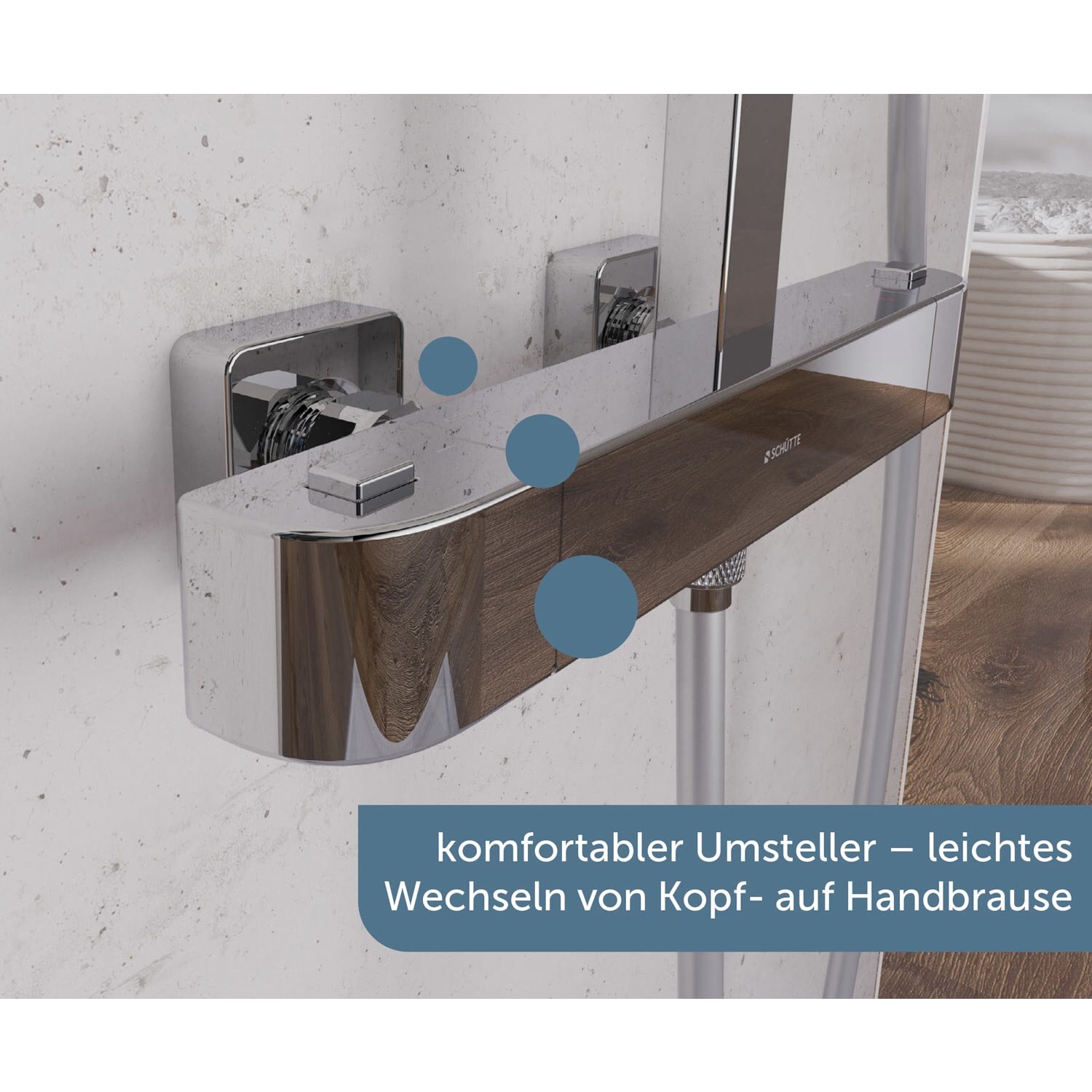 - integrierter Umsteller (Wechsel zw. Kopf- und Handbrause) an der Duschstange