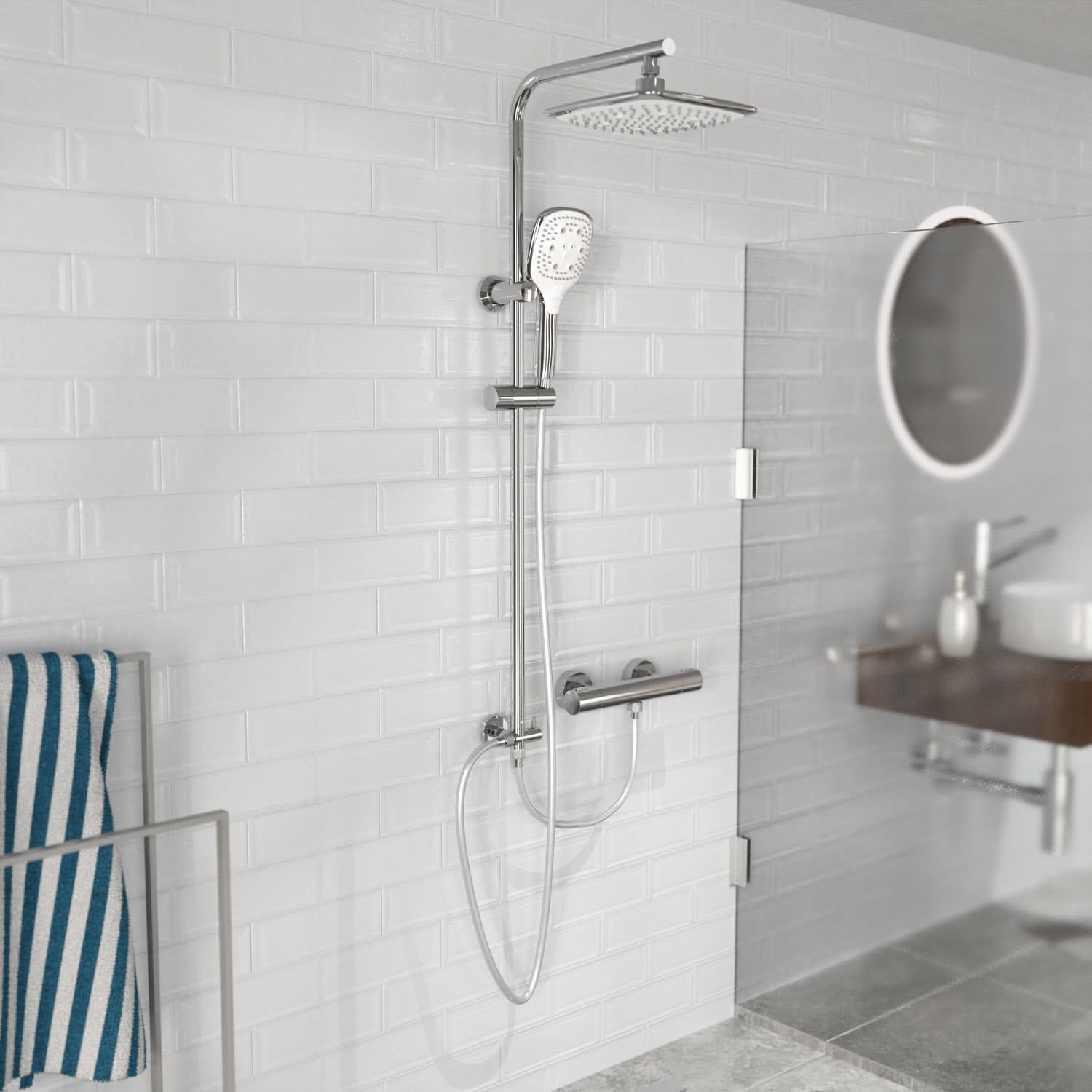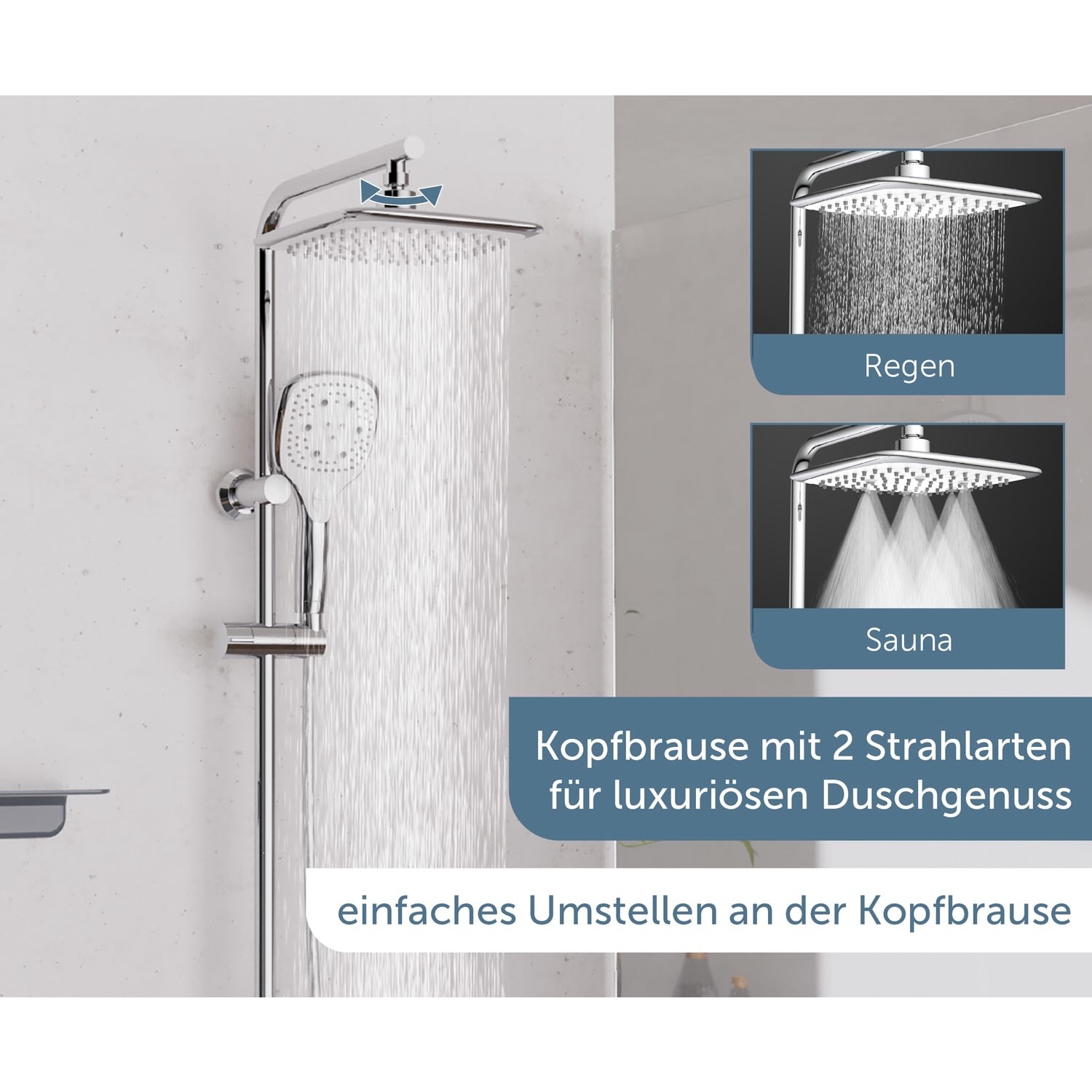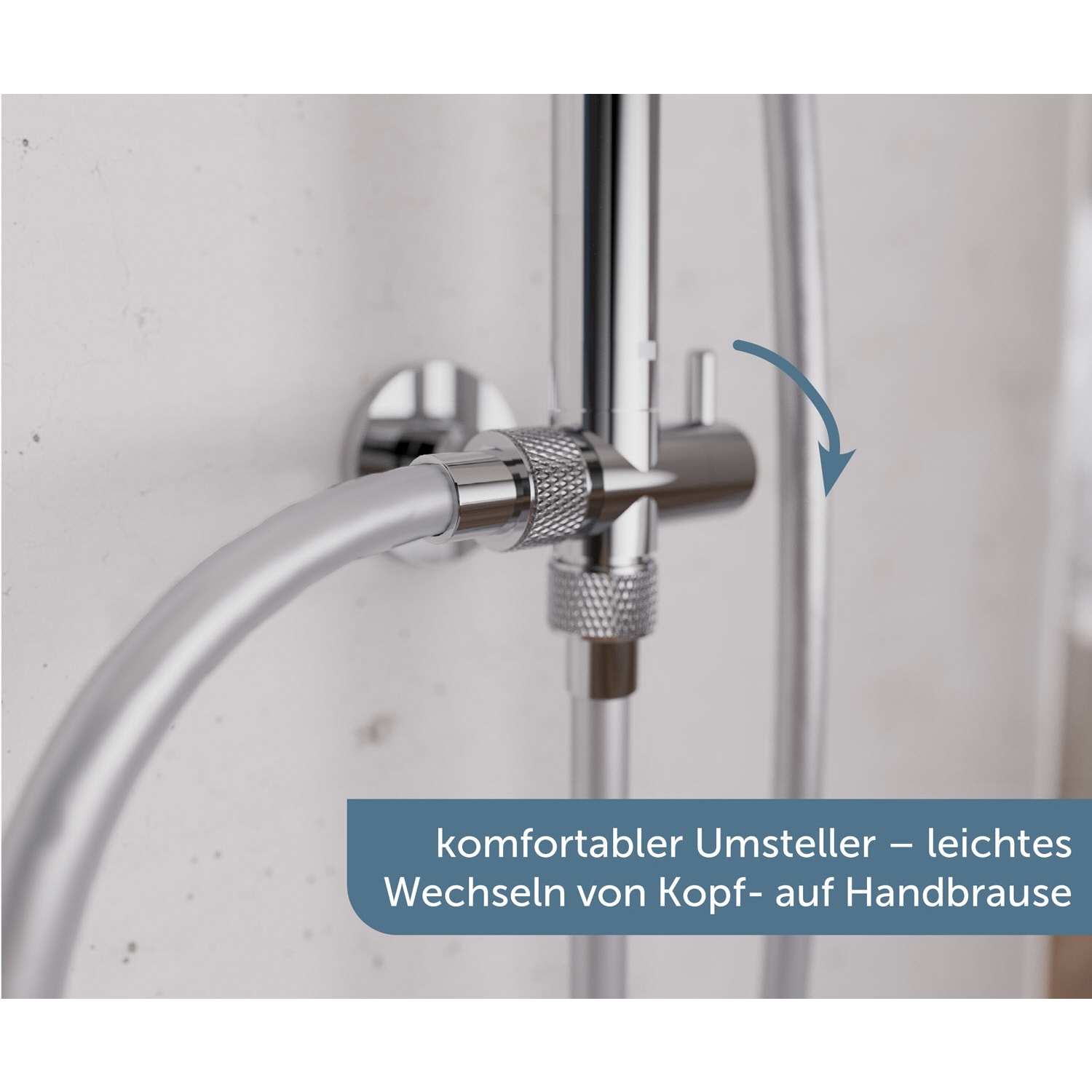 Duschstange mit integriertem Umsteller für den einfachen Wechsel zwischen Regendusche und Handbrause. Die Wellness Handbrause verfügt über drei Strahlarten, individuell einstellbar je nach Duschtyp. Der Brausekopf mit Antikalk-Noppen für die einfache Entfernung von Kalkrückständen. Brauseschlauch mit Verdrehschutz: der drehbare Anschluss sorgt dafür, dass sich der Brauseschlauch nicht verdreht – für reibungslosen Duschkomfort, mehr Flexibilität und eine längere Lebensdauer des Schlauchs.