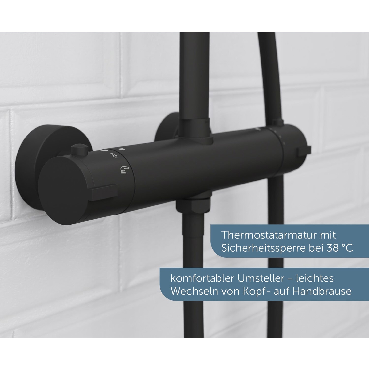 - Mit dem integrierten Umsteller kann bequem zwischen Kopf- und Handbrause gewechselt werden. Je nach Duschtyp.