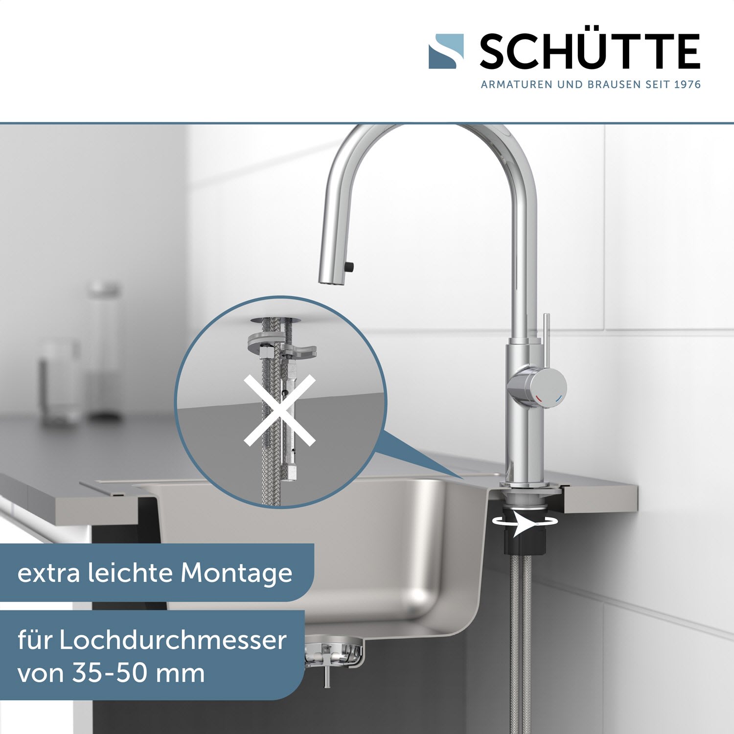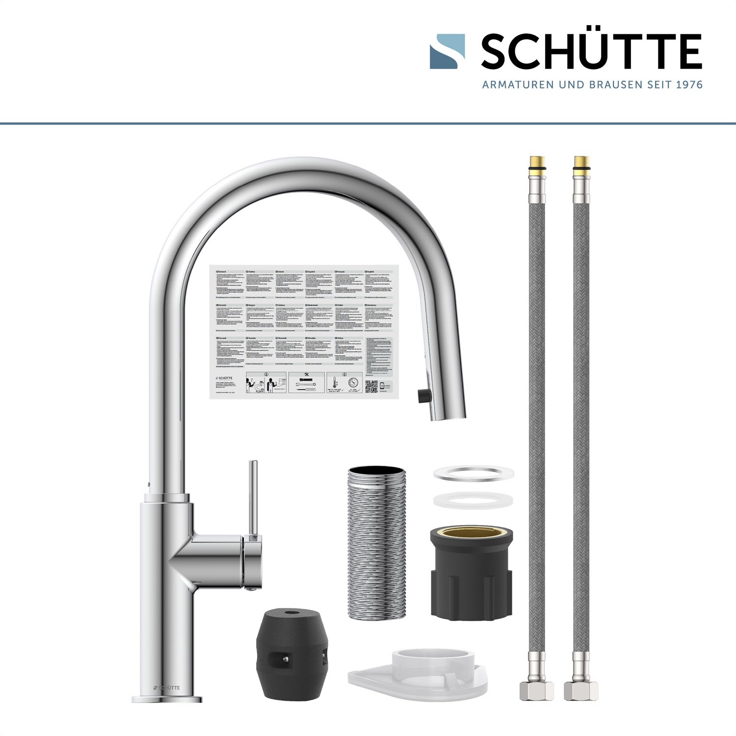 Im Lieferumfang enthalten ist ein vollständiges Montageset und eine mehrsprachige, bebilderte Montageanleitung. Die korrosionsbeständigen Anschlussschläuche (ca. 50 cm) an das Hauswassersystem sind flexibel und leicht zu montieren.