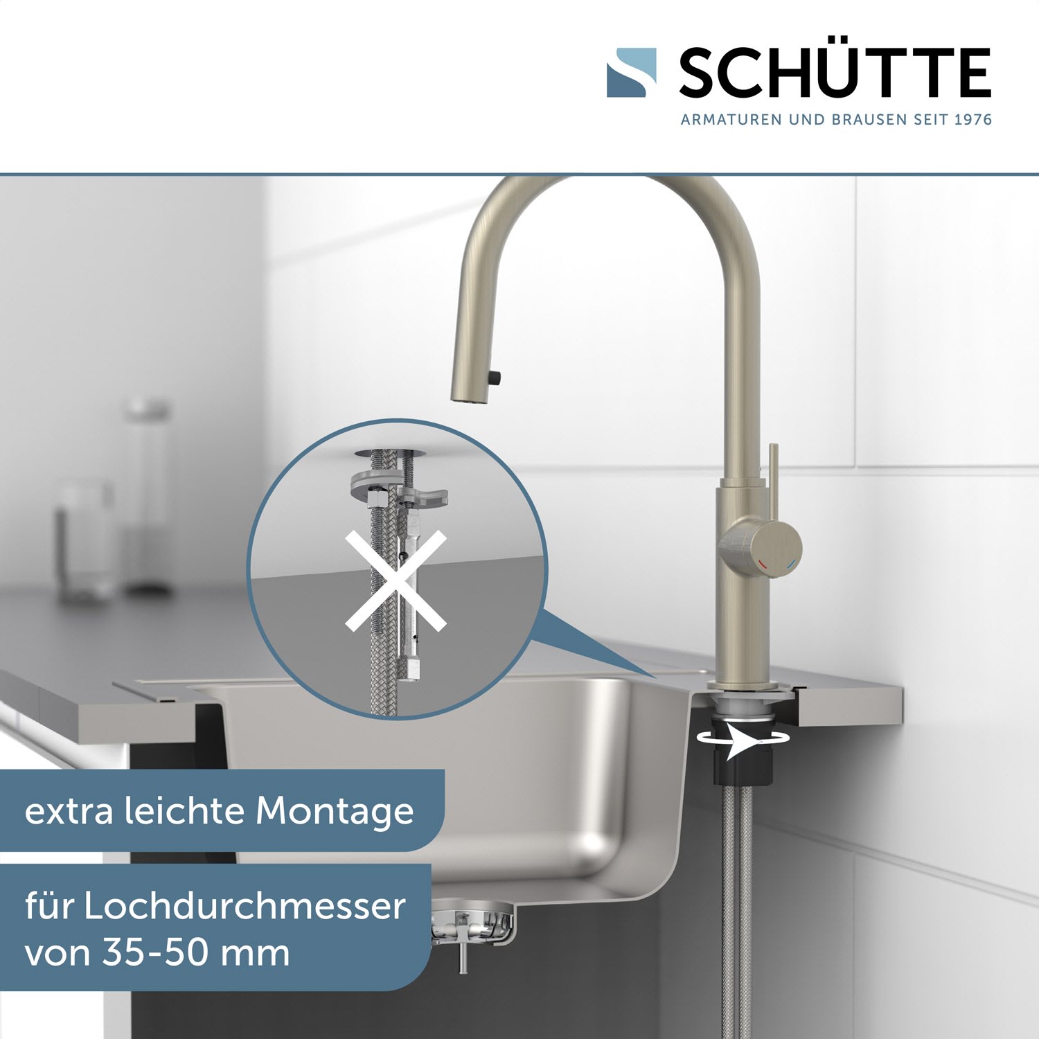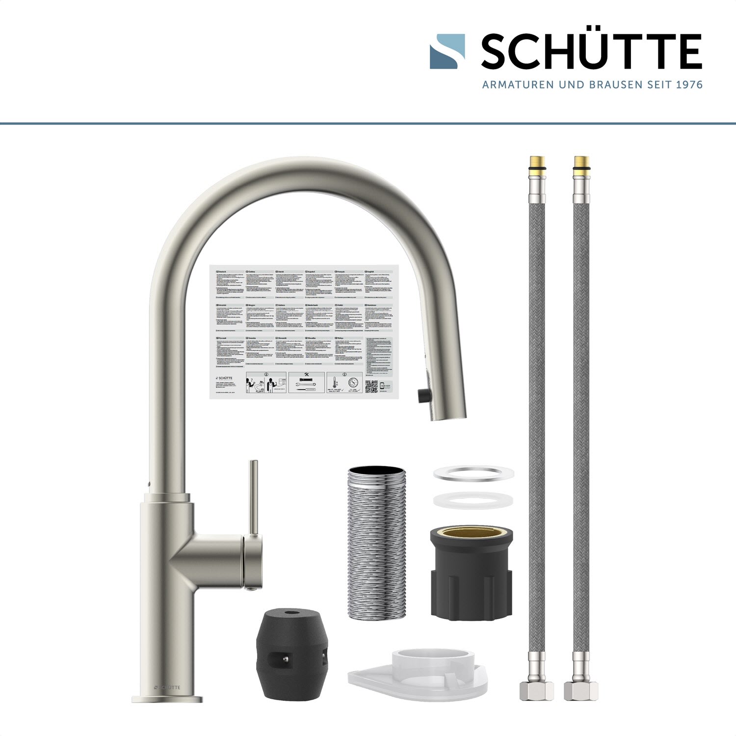 Im Lieferumfang enthalten ist ein vollständiges Montageset und eine mehrsprachige, bebilderte Montageanleitung. Die korrosionsbeständigen Anschlussschläuche (ca. 50 cm) an das Hauswassersystem sind flexibel und leicht zu montieren.