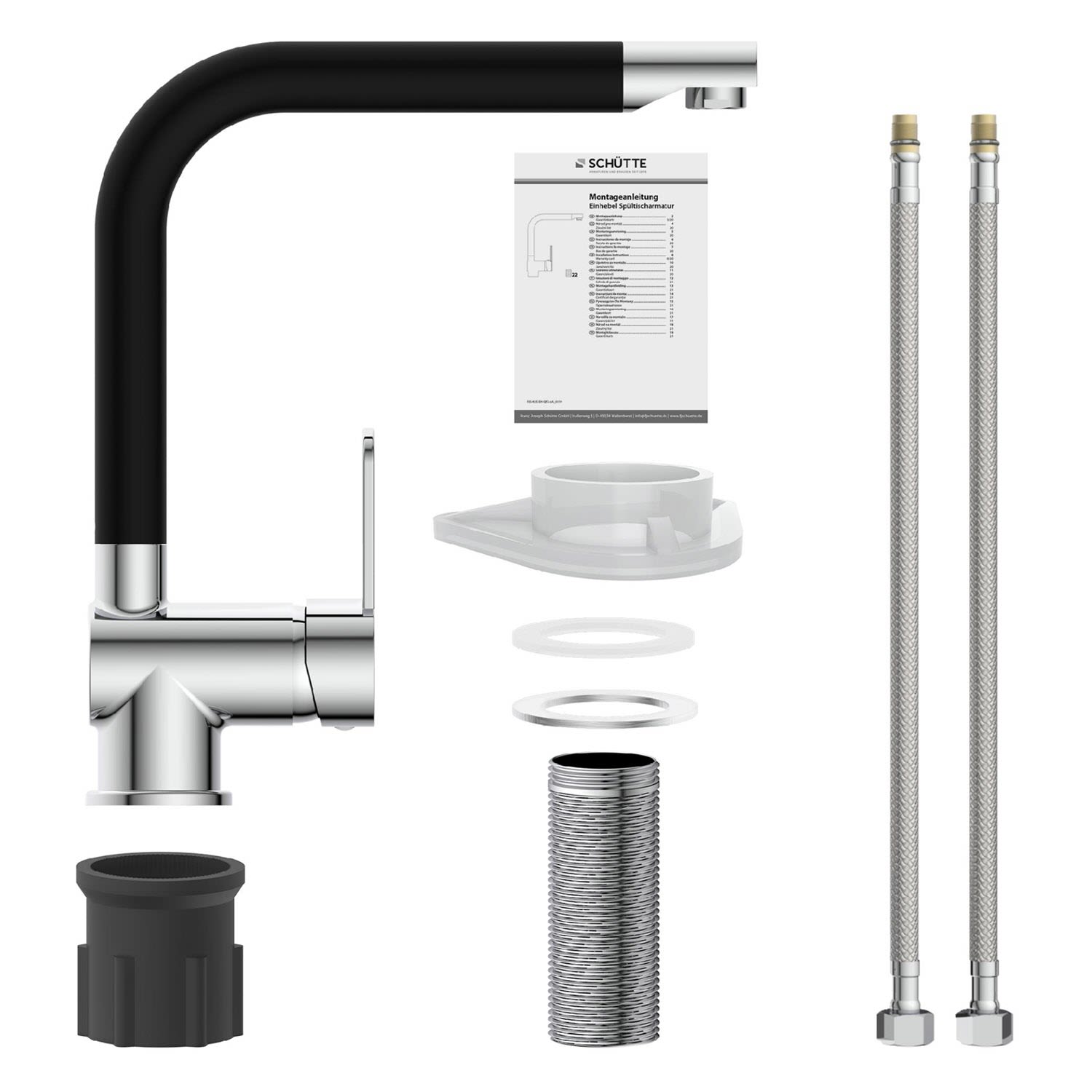 - Im Lieferumfang enthalten ist ein vollständiges Montageset und eine mehrsprachige, bebilderte Montageanleitung. Die korrosionsbeständigen Anschlussschläuche (400 mm) an das Hauswassersystem sind aus einem flexiblem Metallgewinde und einfach in der Montage.