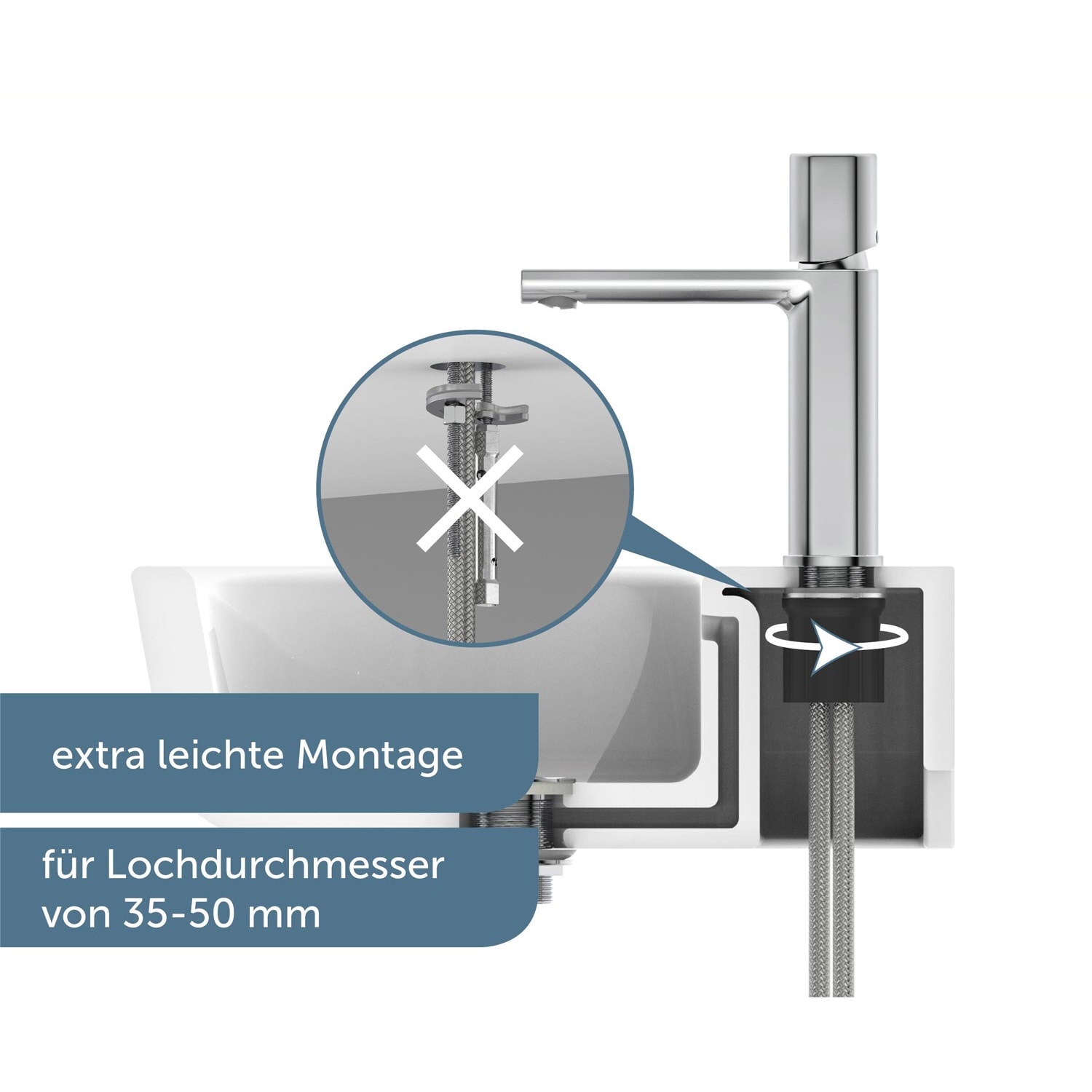 - Abgerundet wird die Badarmatur durch ihre einfache Montage. Die mitgelieferte Zentralverschraubung ist praktisch, selbsterklärend und kann ohne Fachkenntnisse schnell umgesetzt werden.