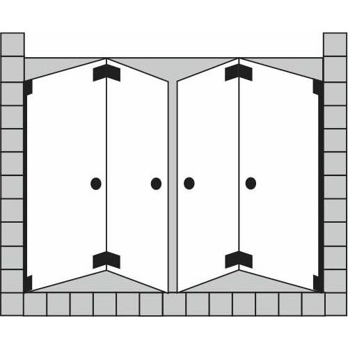 - bestehend aus zwei nach innen und außen schwenkbaren Wandelementen (0,8 cm) und zwei nach außen schwenkbaren Türelementen (0,6 cm) mit innen glasbündigen Scharnieren (Heb- und Senk-Pendelbeschlag)