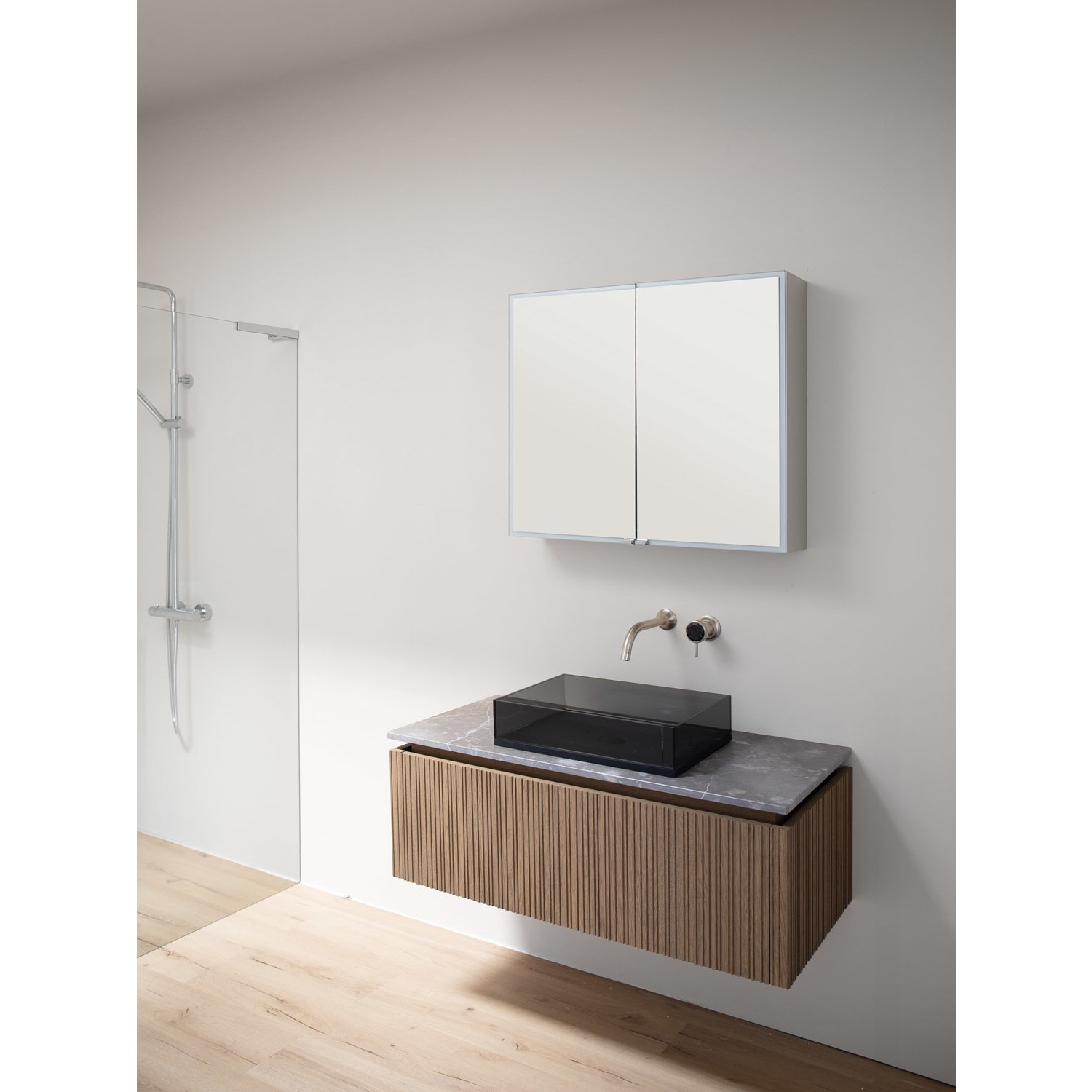 - hochwertige Kristall-Doppelspiegeltür mit sandgestrahltem Rahmen ohne Fuge