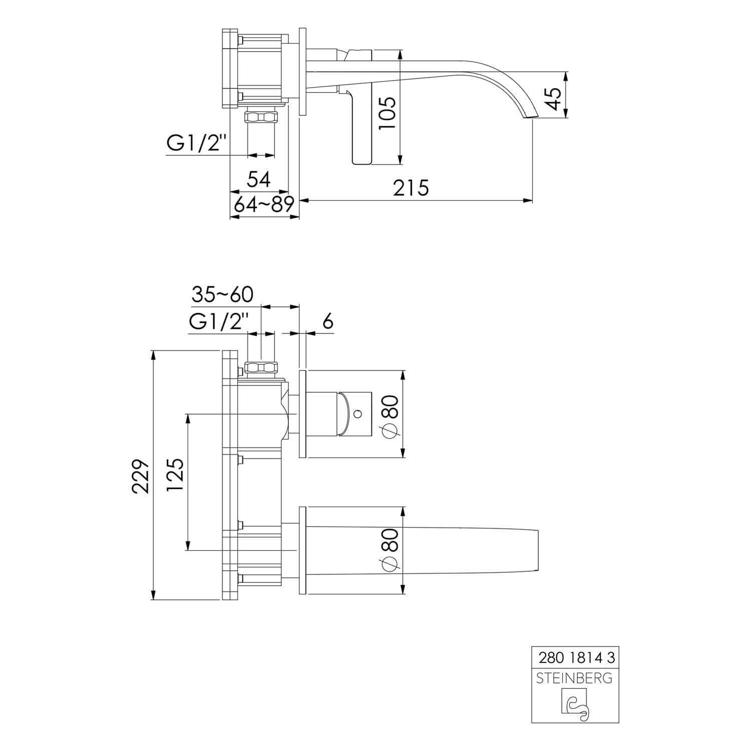 Steinberg Serie 280 Wand-Waschtisch Einhebelmischer, Ausladung 21,5 cm
