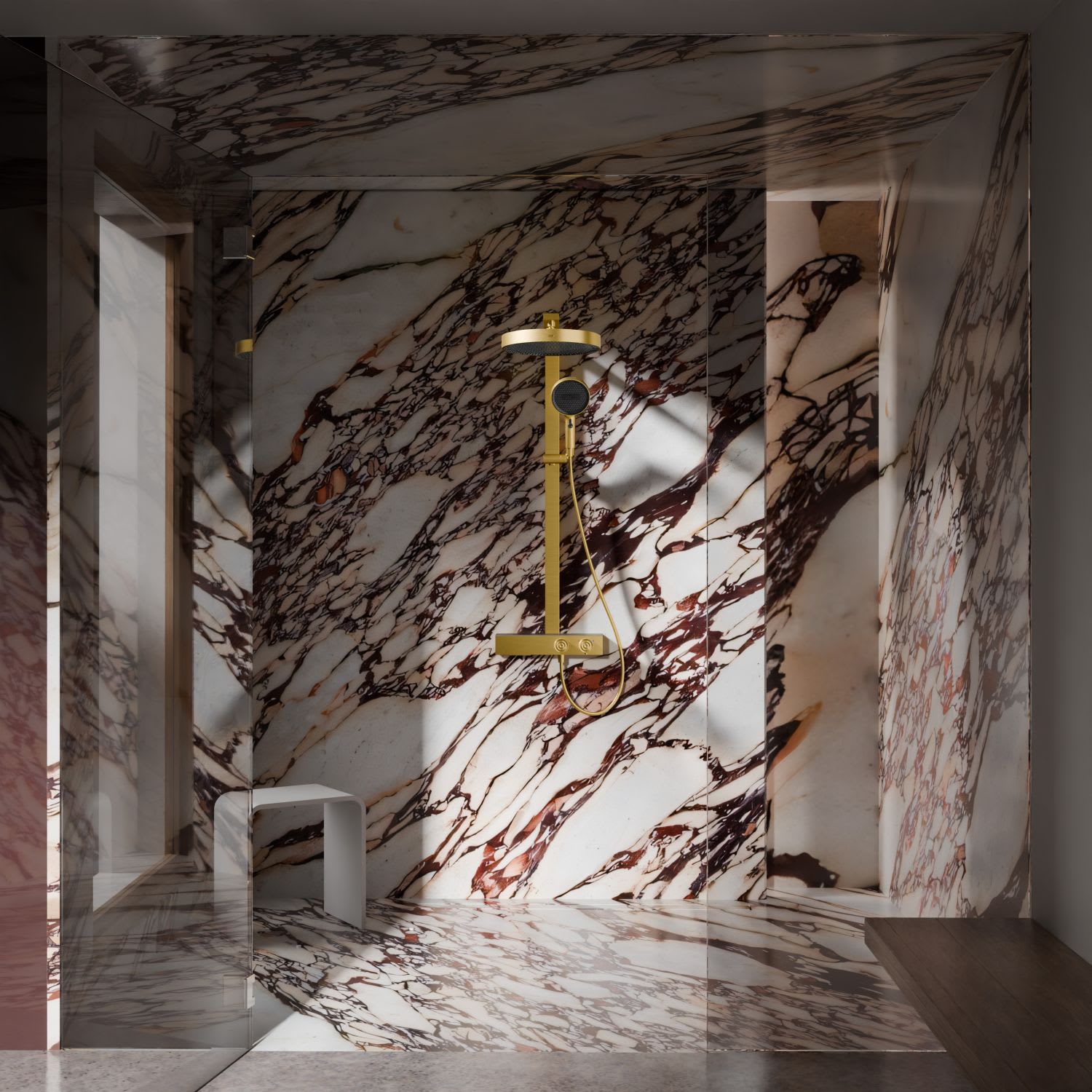 Erhältlich in verschiedenen hochwertigen Oberflächen lässt sich das Duschsystem individuell auf unterschiedliche Raumkonzepte abstimmen. Jede Oberfläche überzeugt durch ihre beständige Qualität und eine präzise Ausführung, die den Charakter des Materials betont.
