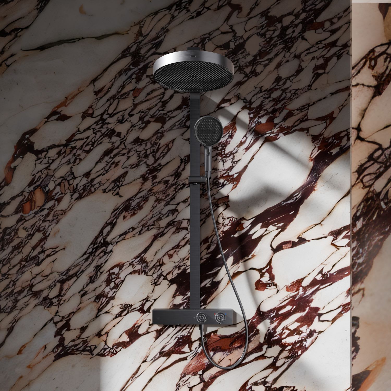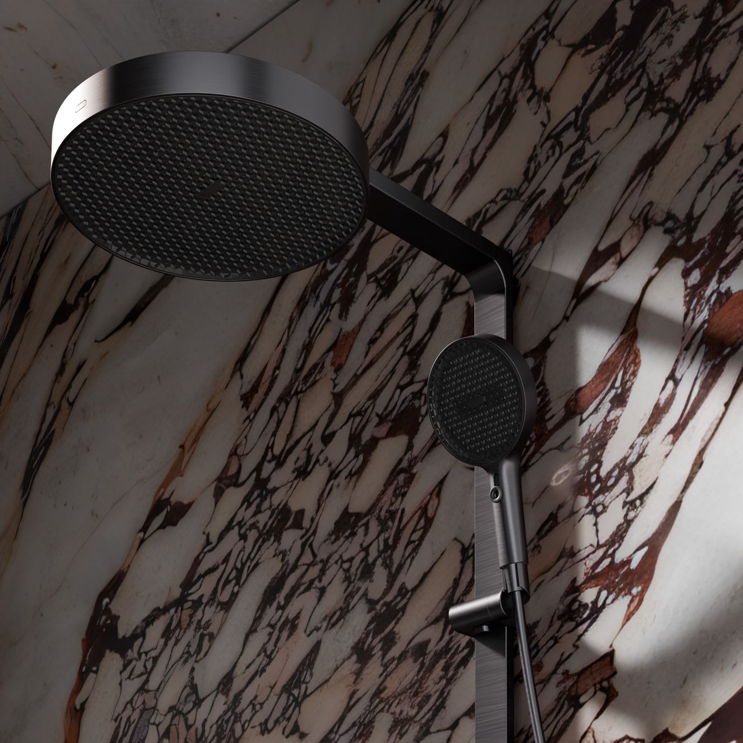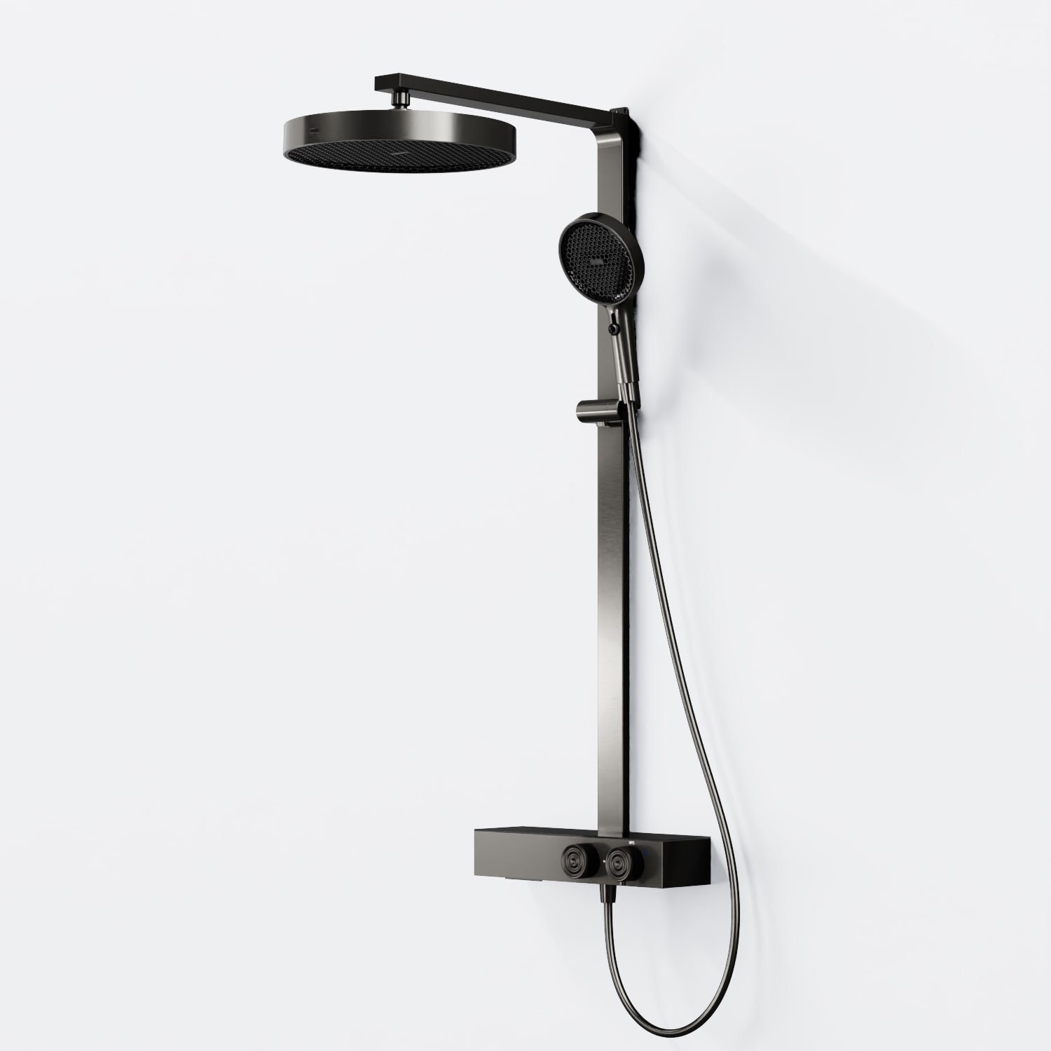 Das Duschsystem steht für funktionale Klarheit und präzise Verarbeitung. Die Kombination aus großflächiger Kopfbrause und einer Handbrause mit zwei Strahlarten bietet Komfort und Flexibilität im täglichen Gebrauch. Mit sorgfältig ausgeführten Details, ausgewogenen Proportionen und langlebigen Materialien fügt sich das System stimmig in moderne Badkonzepte ein.
