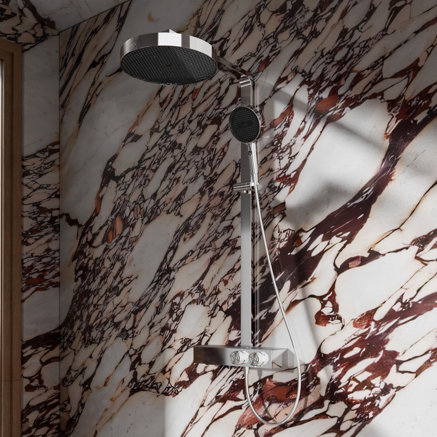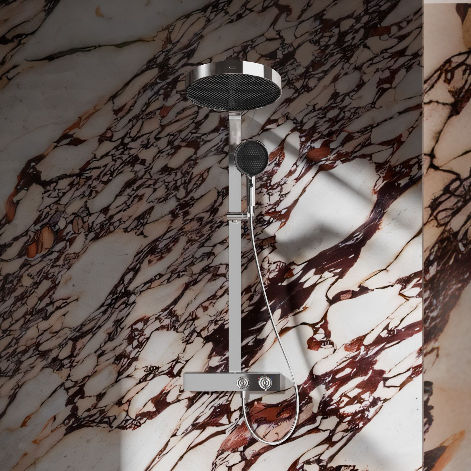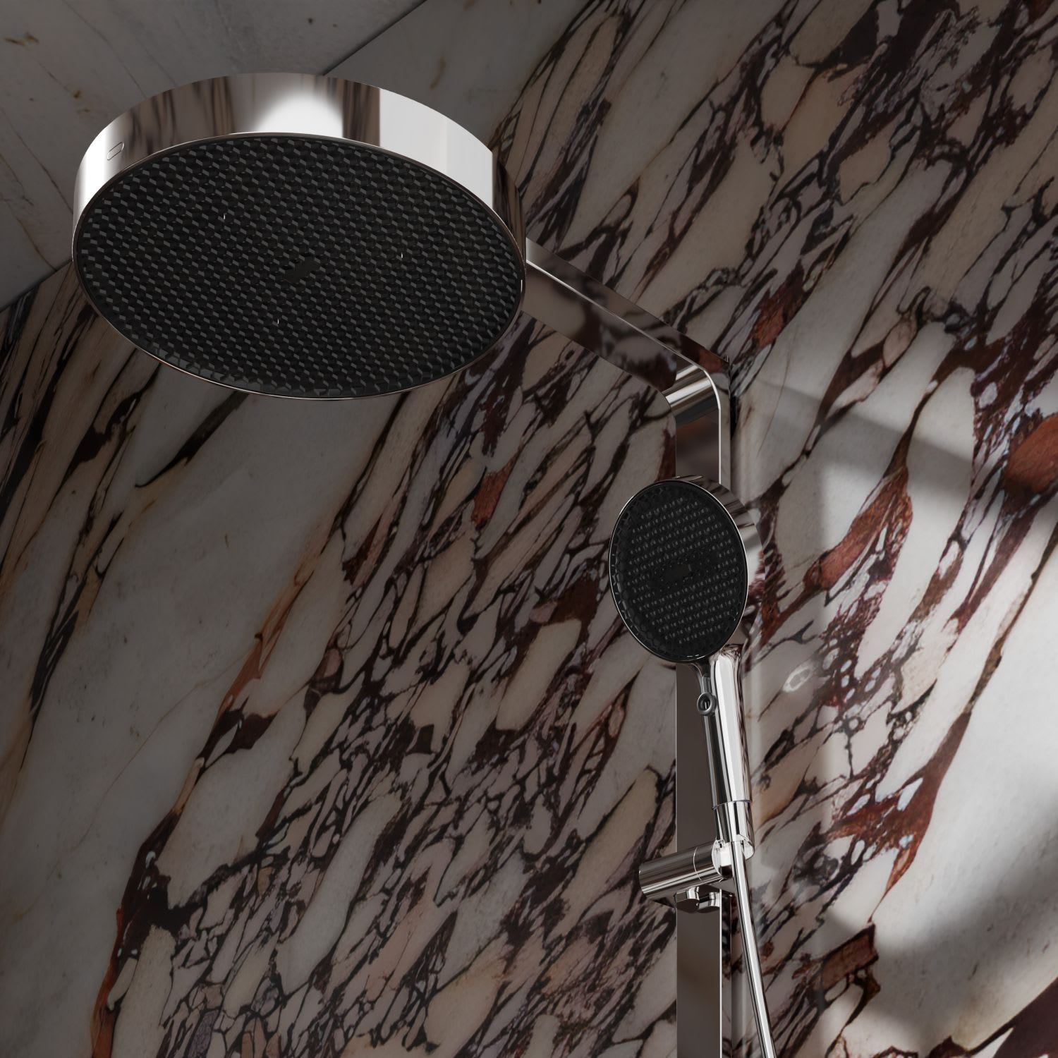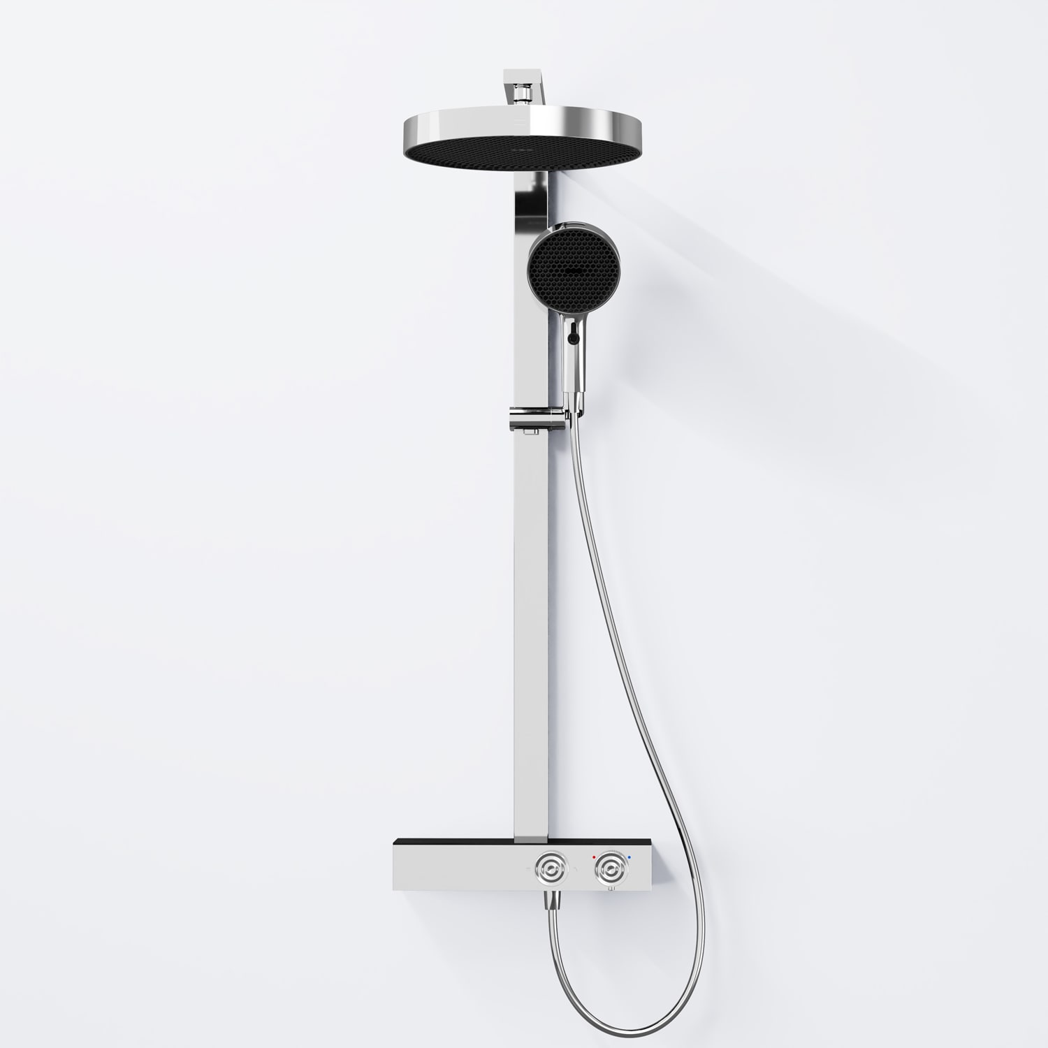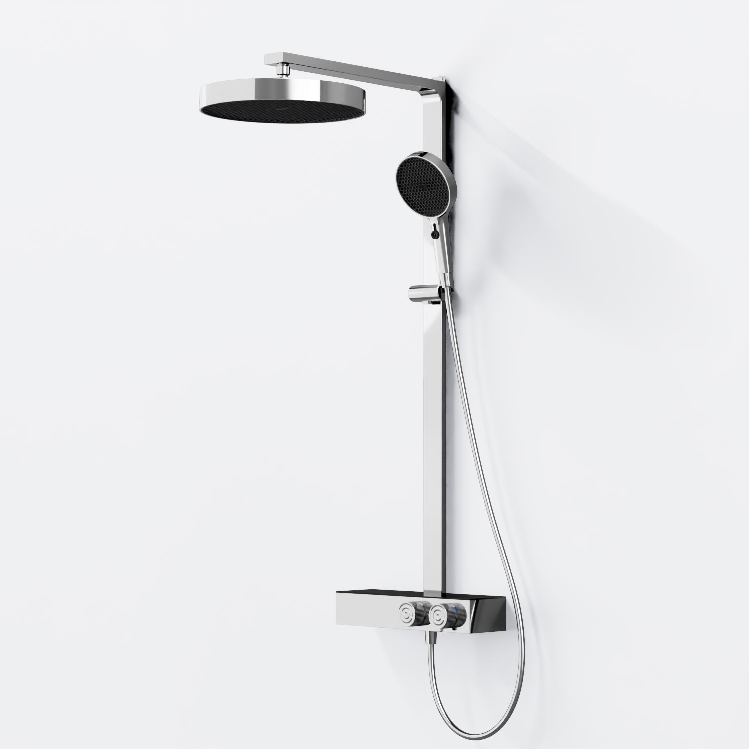 Das Duschsystem steht für funktionale Klarheit und präzise Verarbeitung. Die Kombination aus großflächiger Kopfbrause und einer Handbrause mit zwei Strahlarten bietet Komfort und Flexibilität im täglichen Gebrauch. Mit sorgfältig ausgeführten Details, ausgewogenen Proportionen und langlebigen Materialien fügt sich das System stimmig in moderne Badkonzepte ein.