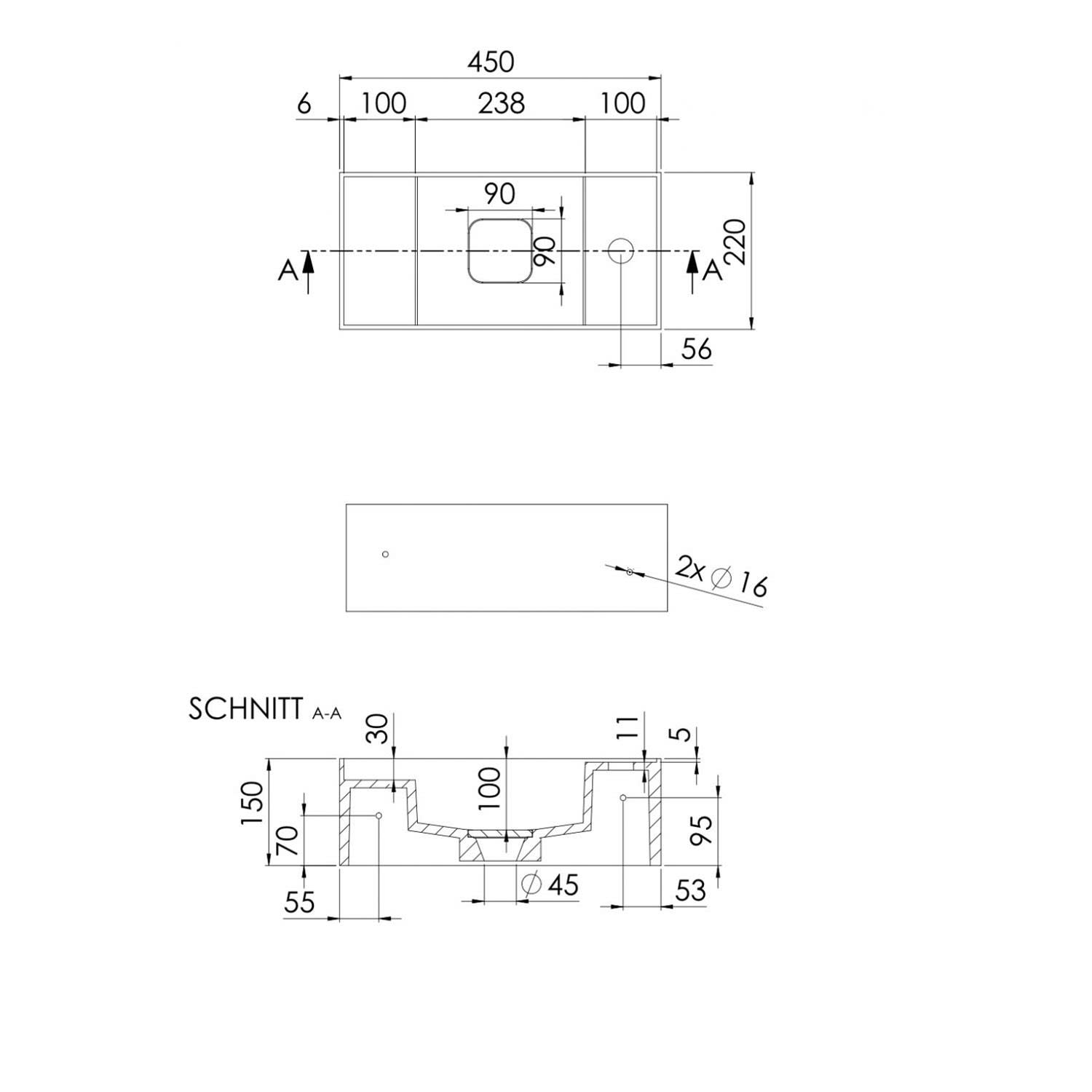 Steinberg Serie 440 Wandwaschtisch 45 x 22 cm, mit Ablagefläche rechts u. links