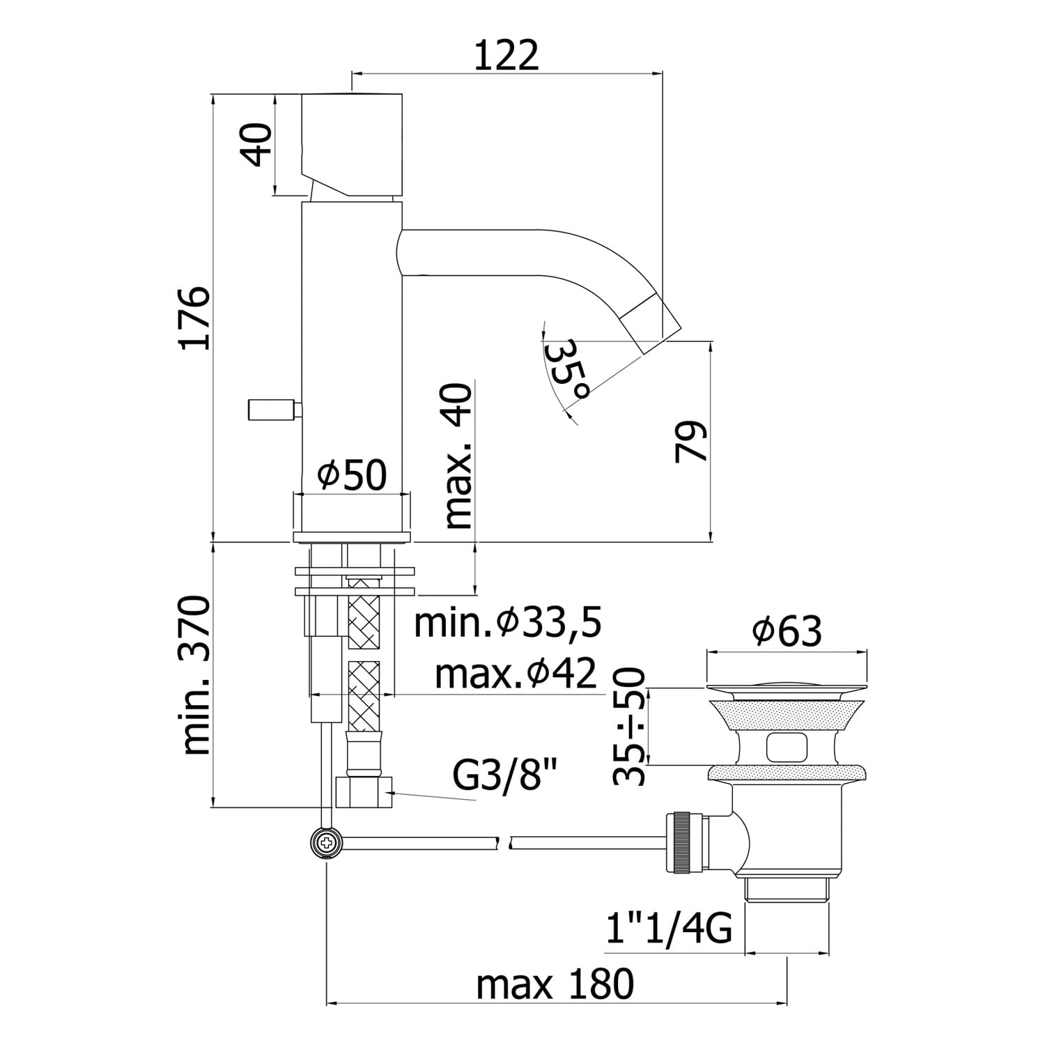 - inklusive Ablaufgarnitur mit Betätigung an der Armatur