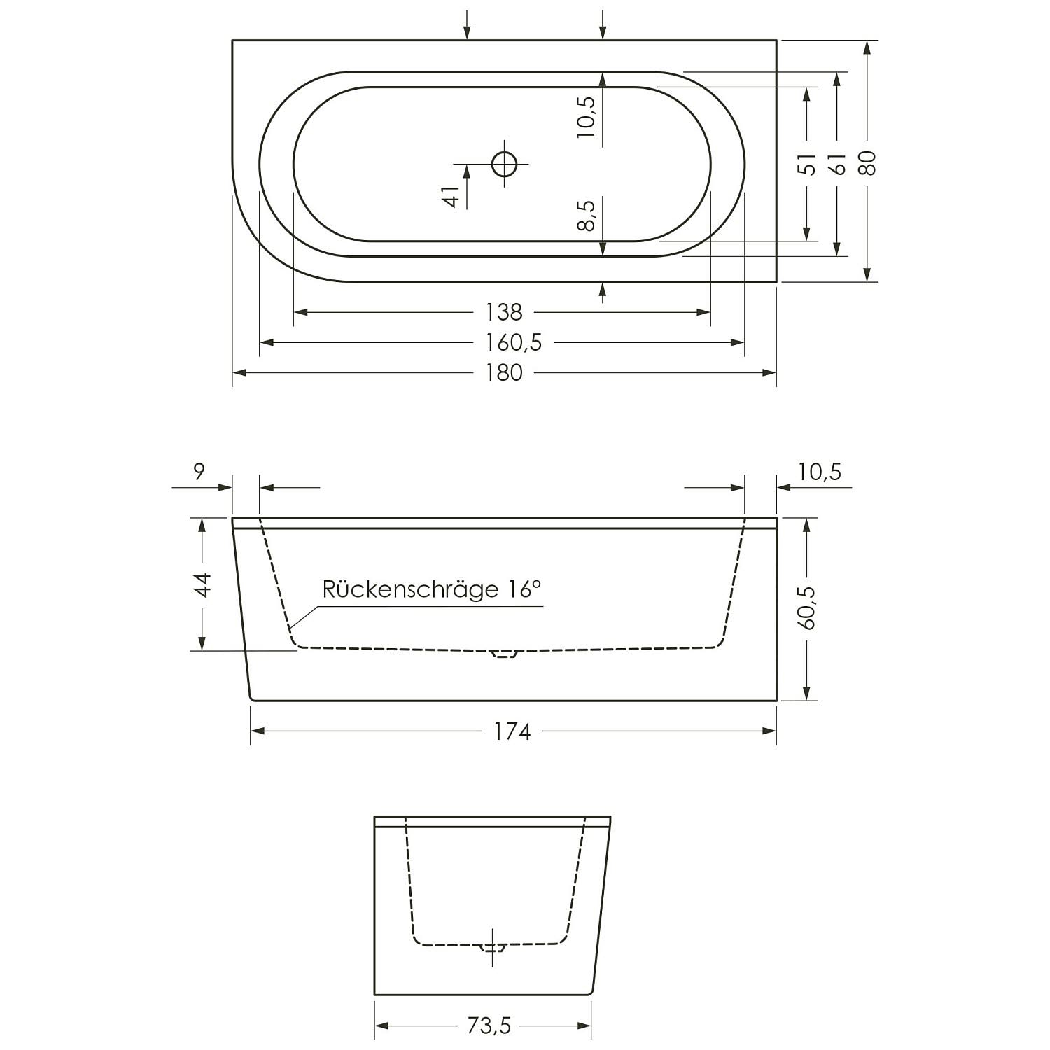 Ideal Standard Dea D-Form-Badewanne 150 x 75 cm, Wandanbindung rechts