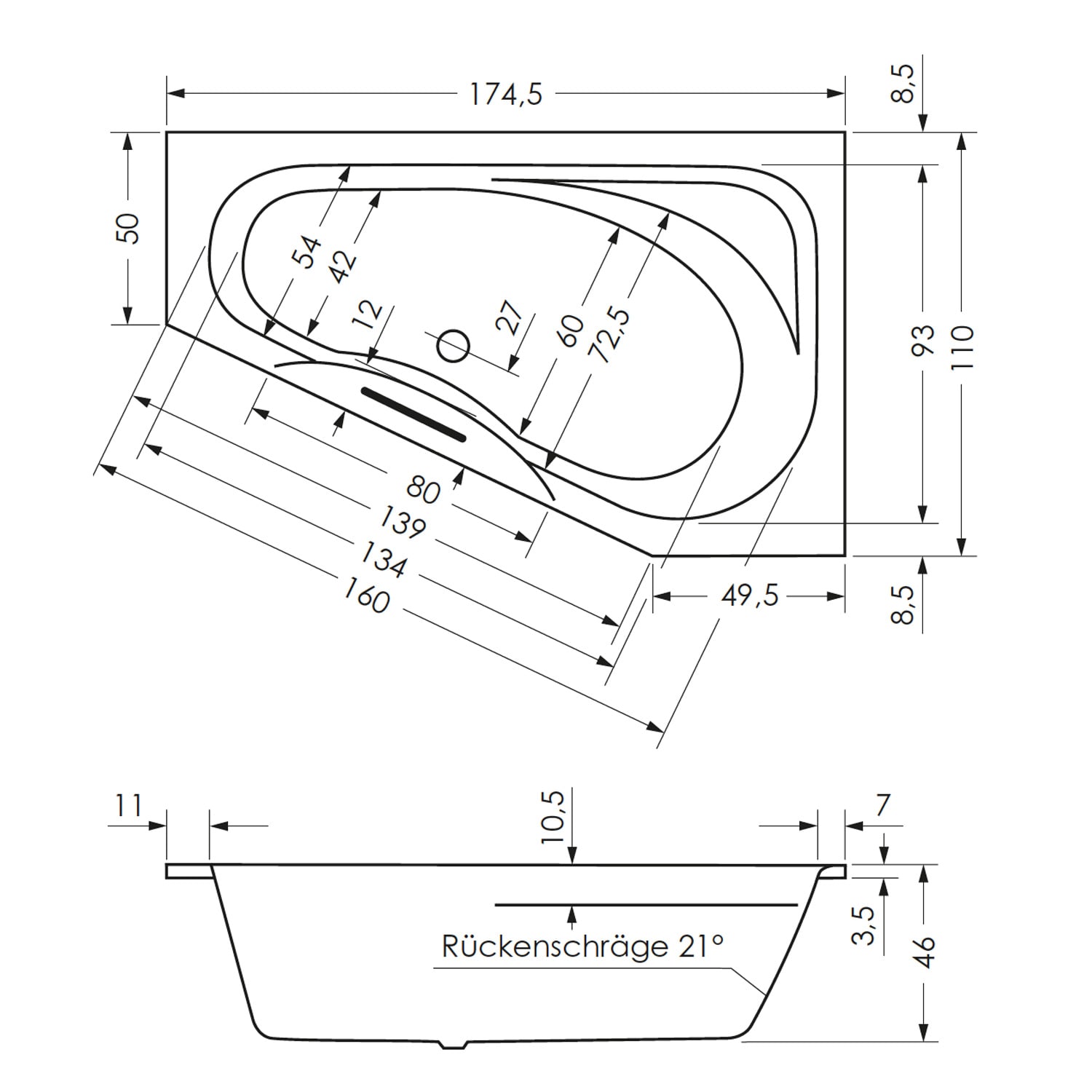 L: 175 B: 110/50 H: 46 cm