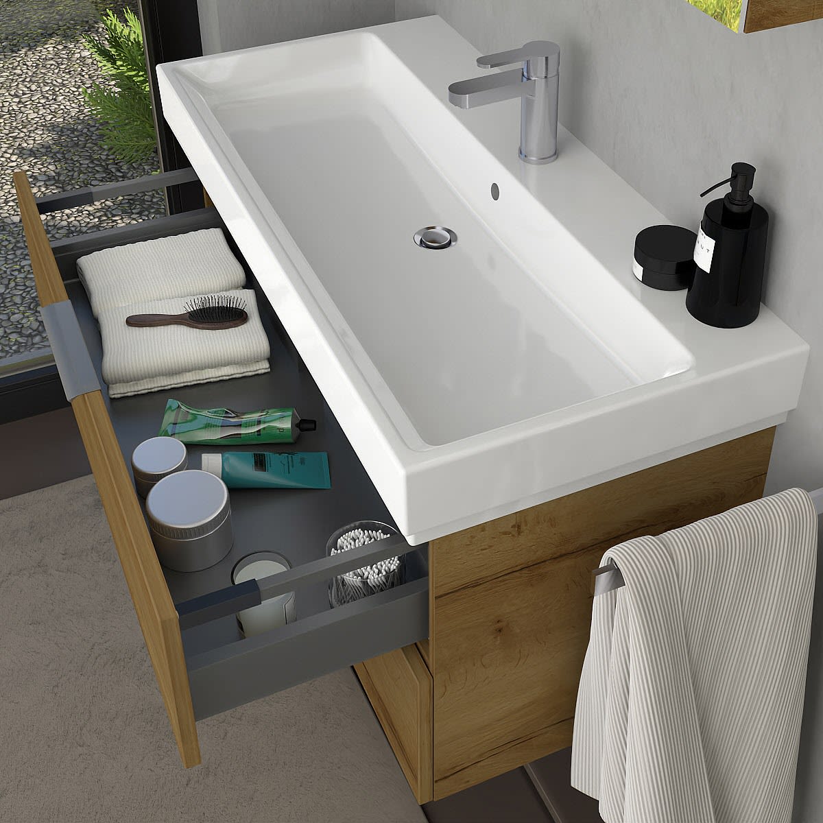 Kombinieren Sie das Design eines Markenwaschtischs mit einer attraktiven Stauraumlösung der Kollektion Living 2.0.