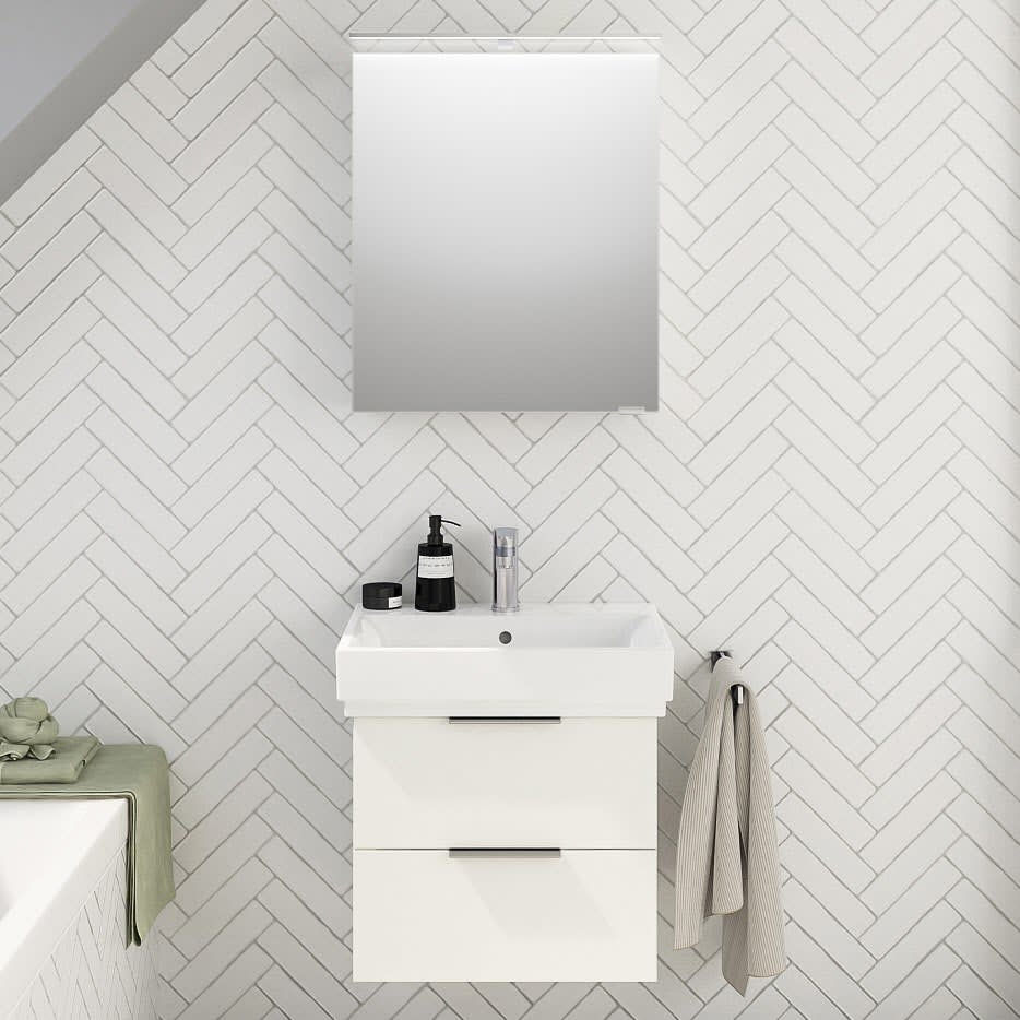Kombinieren Sie das Design eines Markenwaschtischs mit einer attraktiven Stauraumlösung der Kollektion Living 2.0.