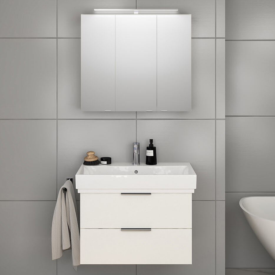 Erhältlich in verschiedenen, zeitgemäßen Dekoren und ausgestattet mit modernem, aufgesetztem Griff aus gebürstetem Edelstahl, verbindet Living 2.0 zeitloses Design mit maximaler Funktionalität. Je nach Waschplatzbreite sorgen großzügige Auszüge oder Türen für optimalen Stauraum – übersichtlich, griffbereit, stilvoll. Ein Spiegelschrank mit LED-Aufsatzleuchte komplettiert das Möbelset.