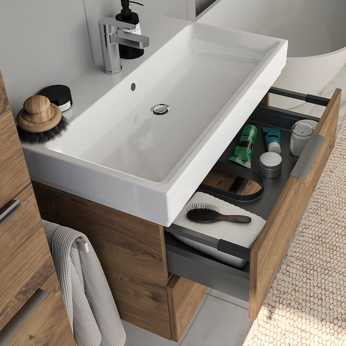 Erhältlich in verschiedenen, zeitgemäßen Dekoren und ausgestattet mit modernem, aufgesetztem Griff aus gebürstetem Edelstahl, verbindet Living 2.0 zeitloses Design mit maximaler Funktionalität. Je nach Waschplatzbreite sorgen großzügige Auszüge oder Türen für optimalen Stauraum – übersichtlich, griffbereit, stilvoll. Ein Spiegelschrank mit LED-Aufsatzleuchte komplettiert das Möbelset.