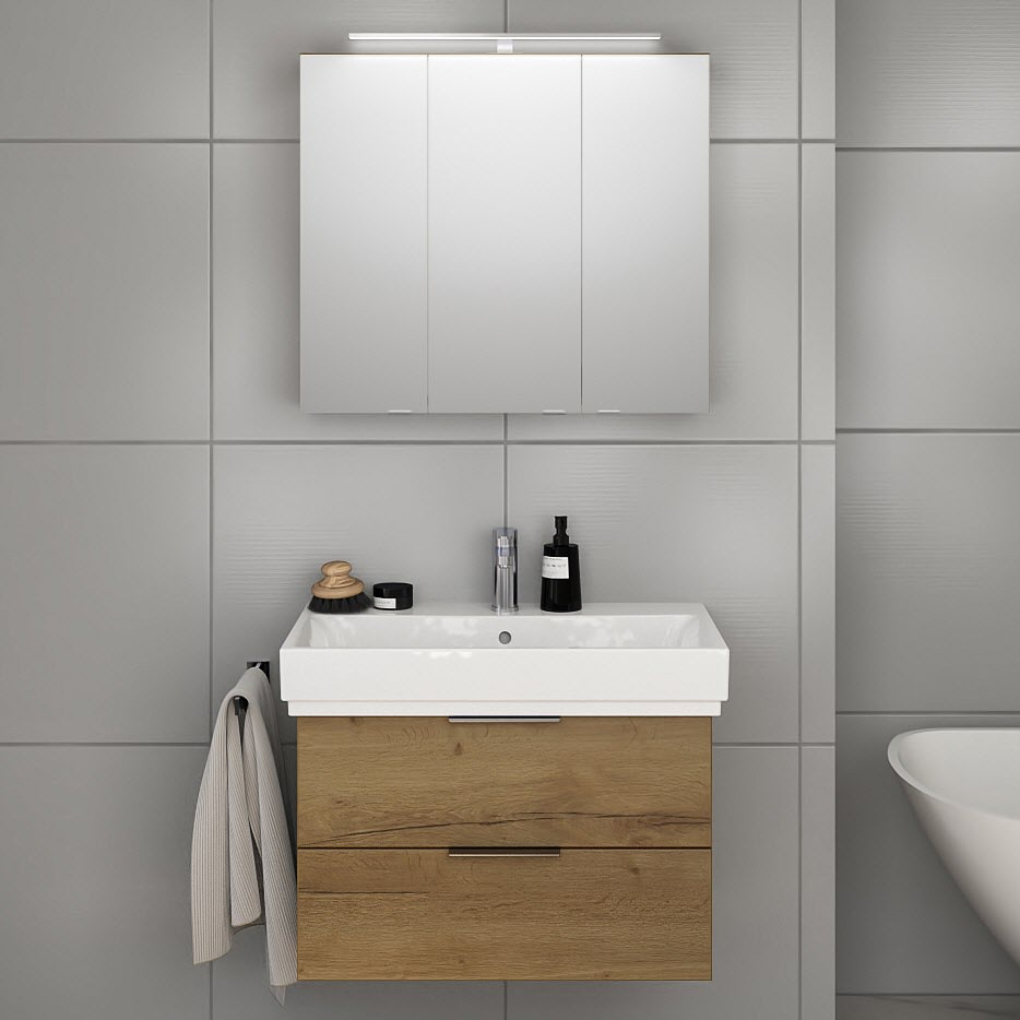 Erhältlich in verschiedenen, zeitgemäßen Dekoren und ausgestattet mit modernem, aufgesetztem Griff aus gebürstetem Edelstahl, verbindet Living 2.0 zeitloses Design mit maximaler Funktionalität. Je nach Waschplatzbreite sorgen großzügige Auszüge oder Türen für optimalen Stauraum – übersichtlich, griffbereit, stilvoll. Ein Spiegelschrank mit LED-Aufsatzleuchte komplettiert das Möbelset.