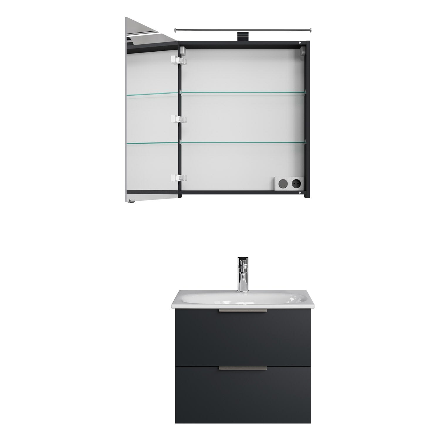 Erhältlich in verschiedenen, zeitgemäßen Dekoren und ausgestattet mit modernem, aufgesetztem Griff aus gebürstetem Edelstahl, verbindet Living 2.0 zeitloses Design mit maximaler Funktionalität. Je nach Waschplatzbreite sorgen großzügige Auszüge oder Türen für optimalen Stauraum – übersichtlich, griffbereit, stilvoll. Ein Spiegelschrank mit LED-Aufsatzleuchte komplettiert das Möbelset.