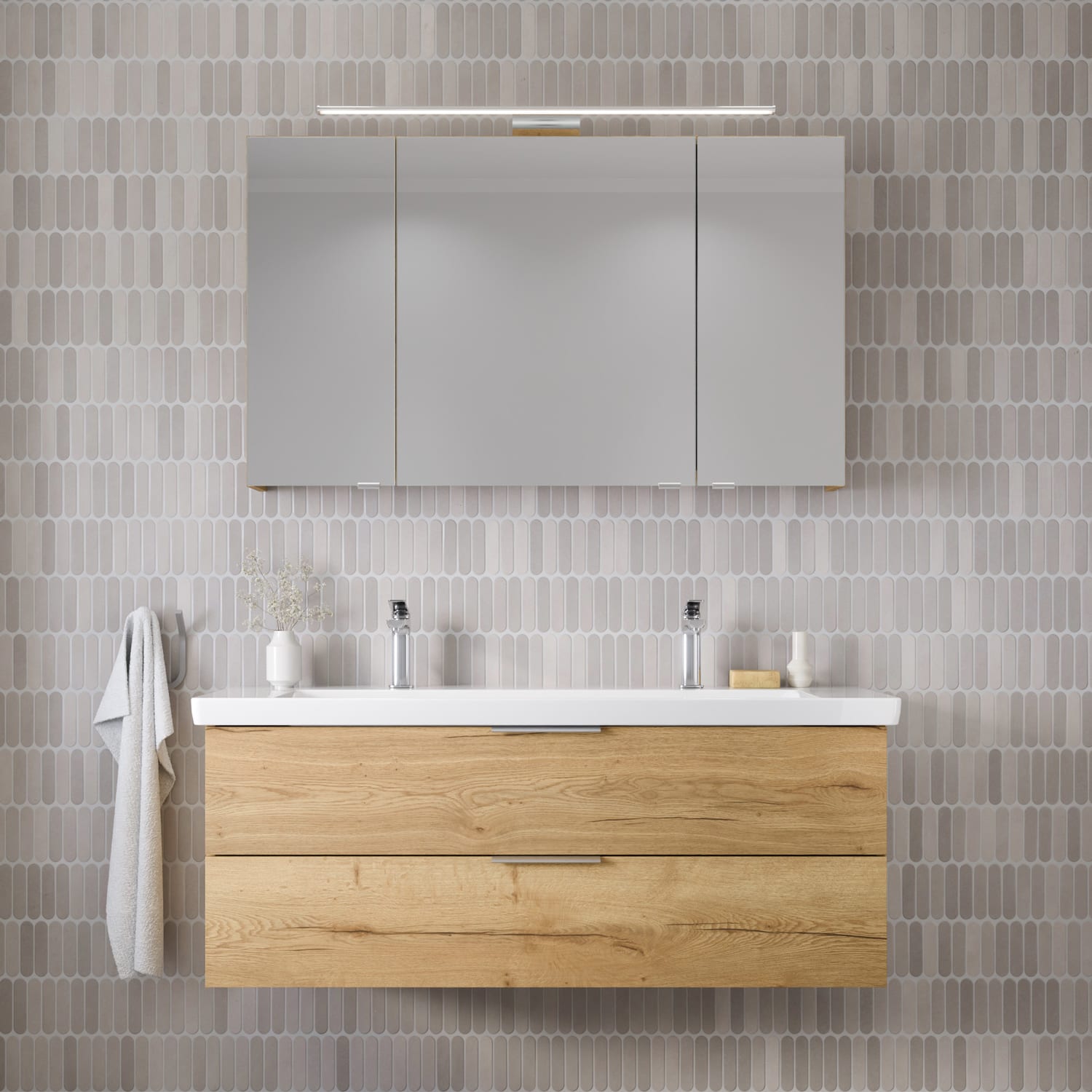 Steinkamp Living 2.0 Spiegelschrank 120 cm mit 3 Türen und LED-Aufsatzleuchte