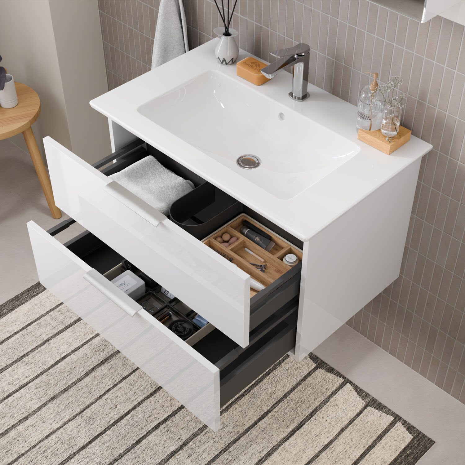 Erhältlich in verschiedenen, zeitgemäßen Dekoren und ausgestattet mit modernem, aufgesetztem Griff aus gebürstetem Edelstahl, verbindet Living 2.0 zeitloses Design mit maximaler Funktionalität. Je nach Waschplatzbreite sorgen großzügige Auszüge oder Türen für optimalen Stauraum – übersichtlich, griffbereit, stilvoll.