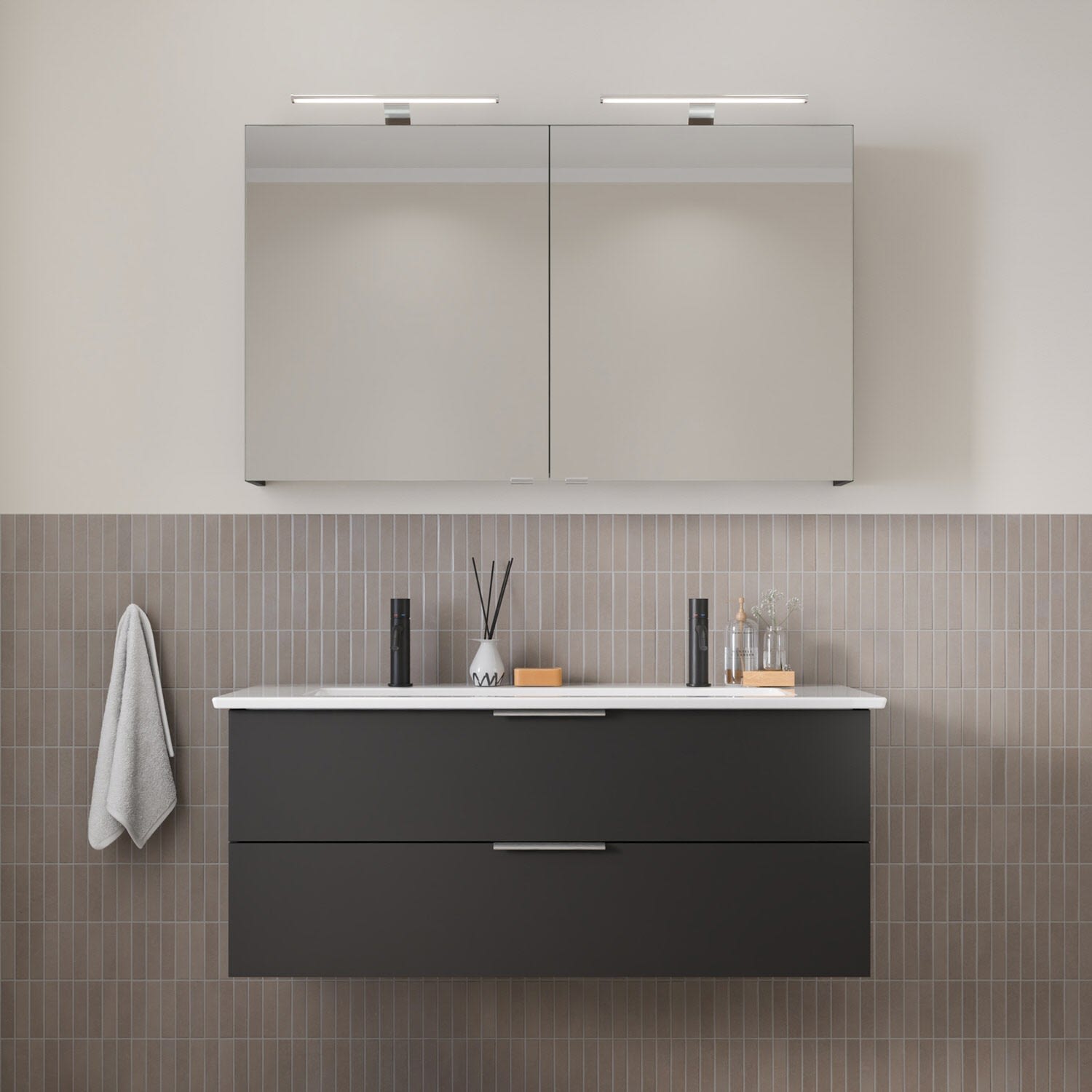 Ergänzen Sie Ihr Badezimmer ganz nach Wunsch mit dem passenden Spiegelschrank oder Hochschrank – für ein rundum stimmiges Einrichtungskonzept.
