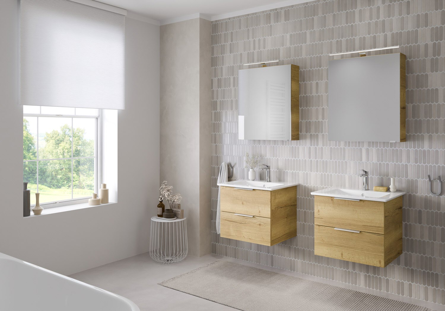 Erhältlich in verschiedenen, zeitgemäßen Dekoren und ausgestattet mit modernem, aufgesetztem Griff aus gebürstetem Edelstahl, verbindet Living 2.0 zeitloses Design mit maximaler Funktionalität. Je nach Waschplatzbreite sorgen großzügige Auszüge oder Türen für optimalen Stauraum – übersichtlich, griffbereit, stilvoll. Ein Spiegelschrank mit LED-Aufsatzleuchte komplettiert das Möbelset.