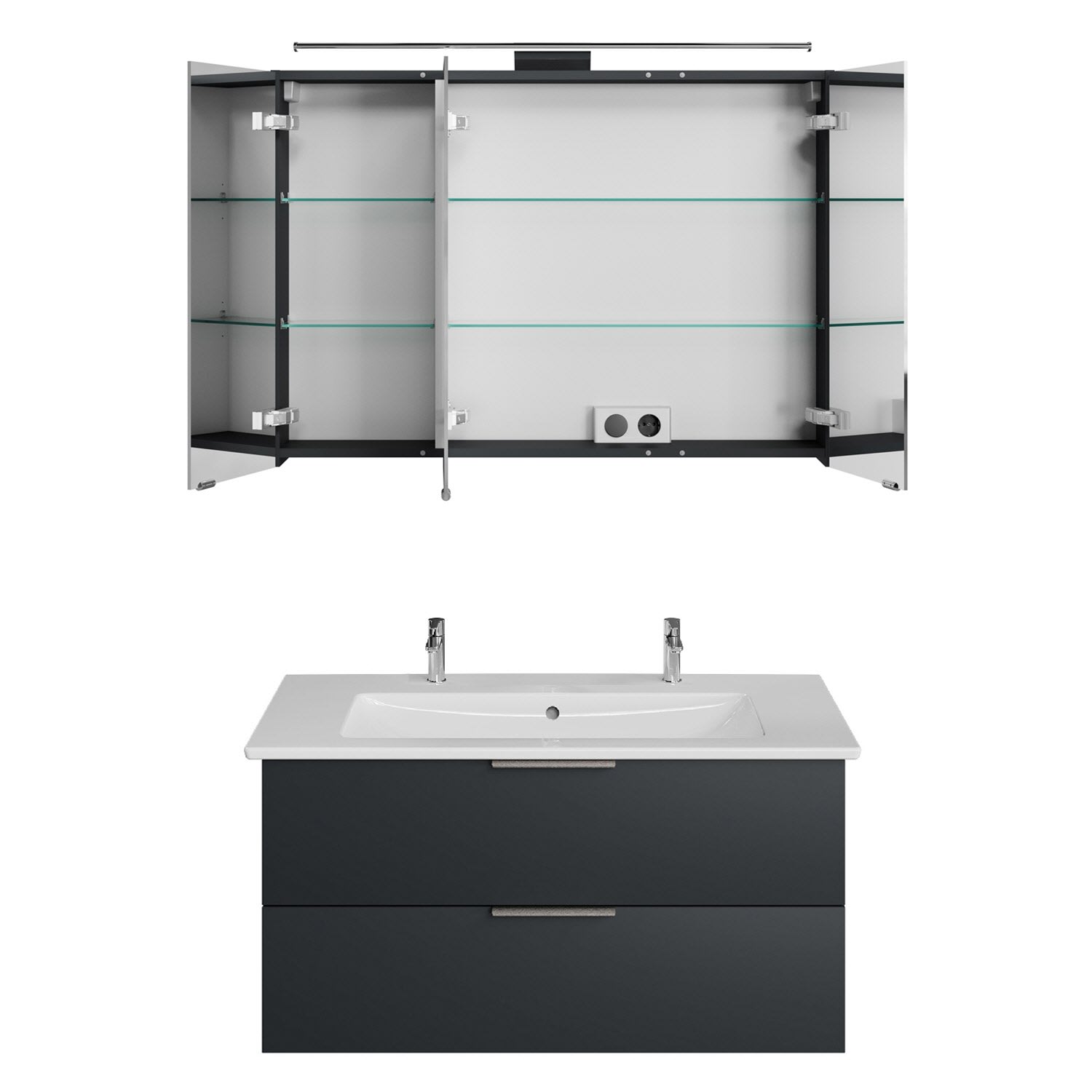 Erhältlich in verschiedenen, zeitgemäßen Dekoren und ausgestattet mit modernem, aufgesetztem Griff aus gebürstetem Edelstahl, verbindet Living 2.0 zeitloses Design mit maximaler Funktionalität. Je nach Waschplatzbreite sorgen großzügige Auszüge oder Türen für optimalen Stauraum – übersichtlich, griffbereit, stilvoll. Ein Spiegelschrank mit LED-Aufsatzleuchte komplettiert das Möbelset.