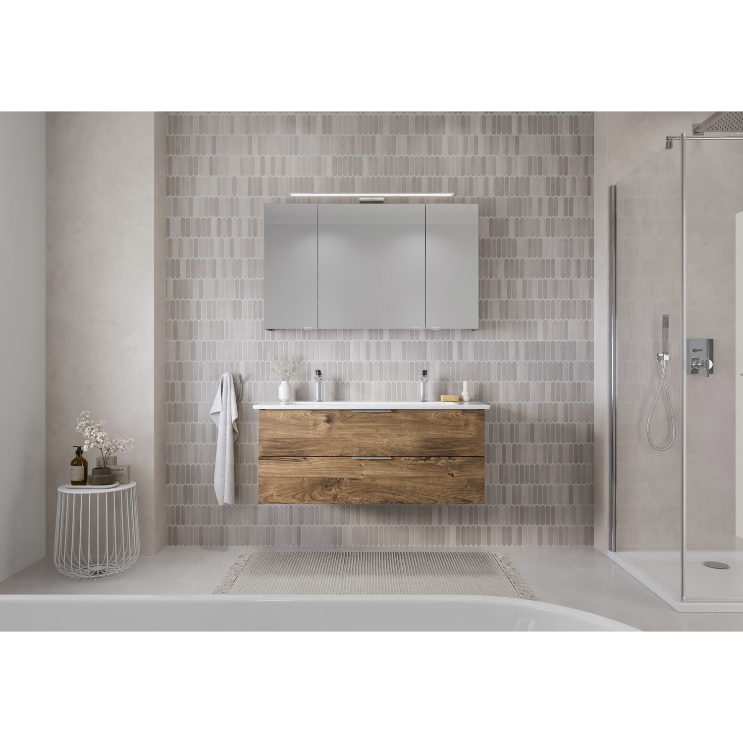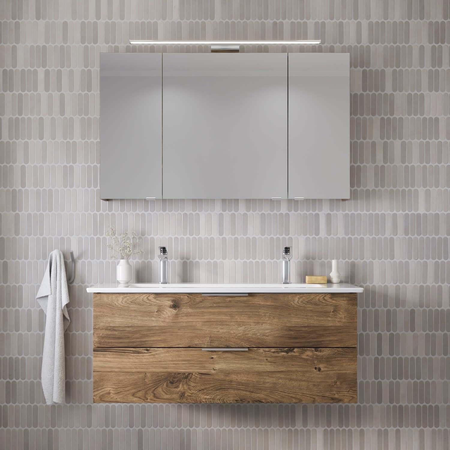 Erhältlich in verschiedenen, zeitgemäßen Dekoren und ausgestattet mit modernem, aufgesetztem Griff aus gebürstetem Edelstahl, verbindet Living 2.0 zeitloses Design mit maximaler Funktionalität. Je nach Waschplatzbreite sorgen großzügige Auszüge oder Türen für optimalen Stauraum – übersichtlich, griffbereit, stilvoll. Ein Spiegelschrank mit LED-Aufsatzleuchte komplettiert das Möbelset.