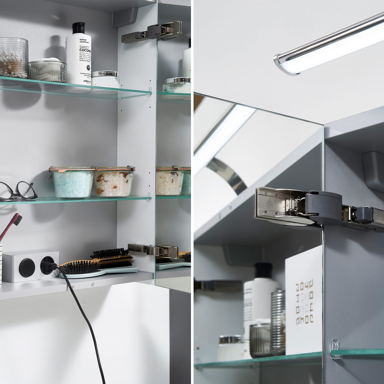 Erhältlich in verschiedenen, zeitgemäßen Dekoren und ausgestattet mit modernem, aufgesetztem Griff aus gebürstetem Edelstahl, verbindet Living 2.0 zeitloses Design mit maximaler Funktionalität. Je nach Waschplatzbreite sorgen großzügige Auszüge oder Türen für optimalen Stauraum – übersichtlich, griffbereit, stilvoll. Ein Spiegelschrank mit LED-Aufsatzleuchte komplettiert das Möbelset.