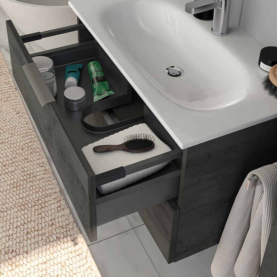 Sie haben bereits einen Waschtisch in Ihrem Bad montiert und wünschen sich mehr Stauraum? Erhältlich in verschiedenen, zeitgemäßen Dekoren und ausgestattet mit modernem, aufgesetztem Griff aus gebürstetem Edelstahl, verbinden die Living 2.0 Waschtischunterschränke zeitloses Design mit maximaler Funktionalität. Je nach Waschplatzbreite sorgen großzügige Auszüge oder Türen für optimalen Stauraum – übersichtlich, griffbereit, stilvoll. Für noch mehr Stauraum ergänzen Sie einen Spiegelschrank oder Hochschrank im passenden Dekor.