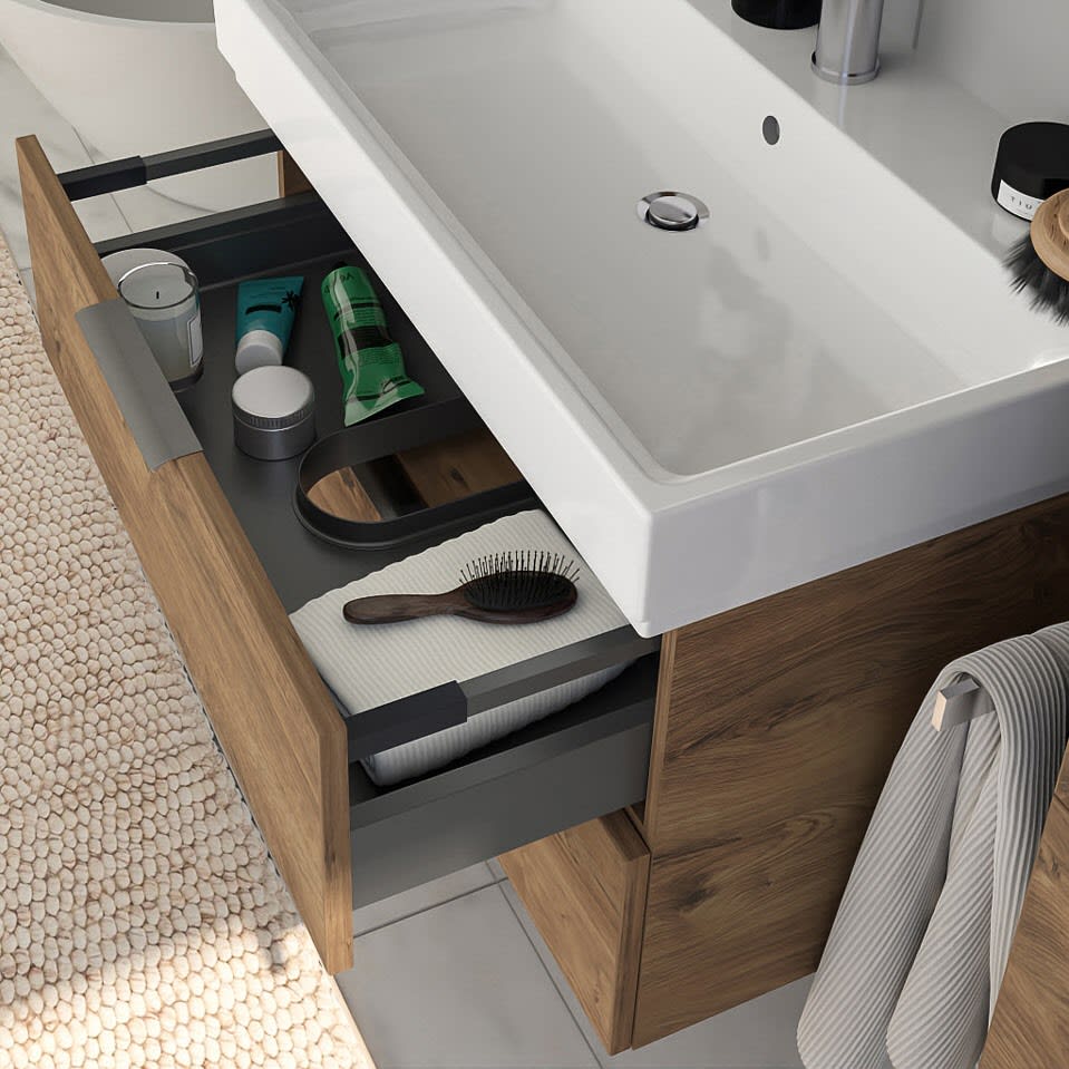 Sie haben bereits einen Waschtisch in Ihrem Bad montiert und wünschen sich mehr Stauraum? Erhältlich in verschiedenen, zeitgemäßen Dekoren und ausgestattet mit modernem, aufgesetztem Griff aus gebürstetem Edelstahl, verbinden die Living 2.0 Waschtischunterschränke zeitloses Design mit maximaler Funktionalität. Je nach Waschplatzbreite sorgen großzügige Auszüge oder Türen für optimalen Stauraum – übersichtlich, griffbereit, stilvoll. Für noch mehr Stauraum ergänzen Sie einen Spiegelschrank oder Hochschrank im passenden Dekor.