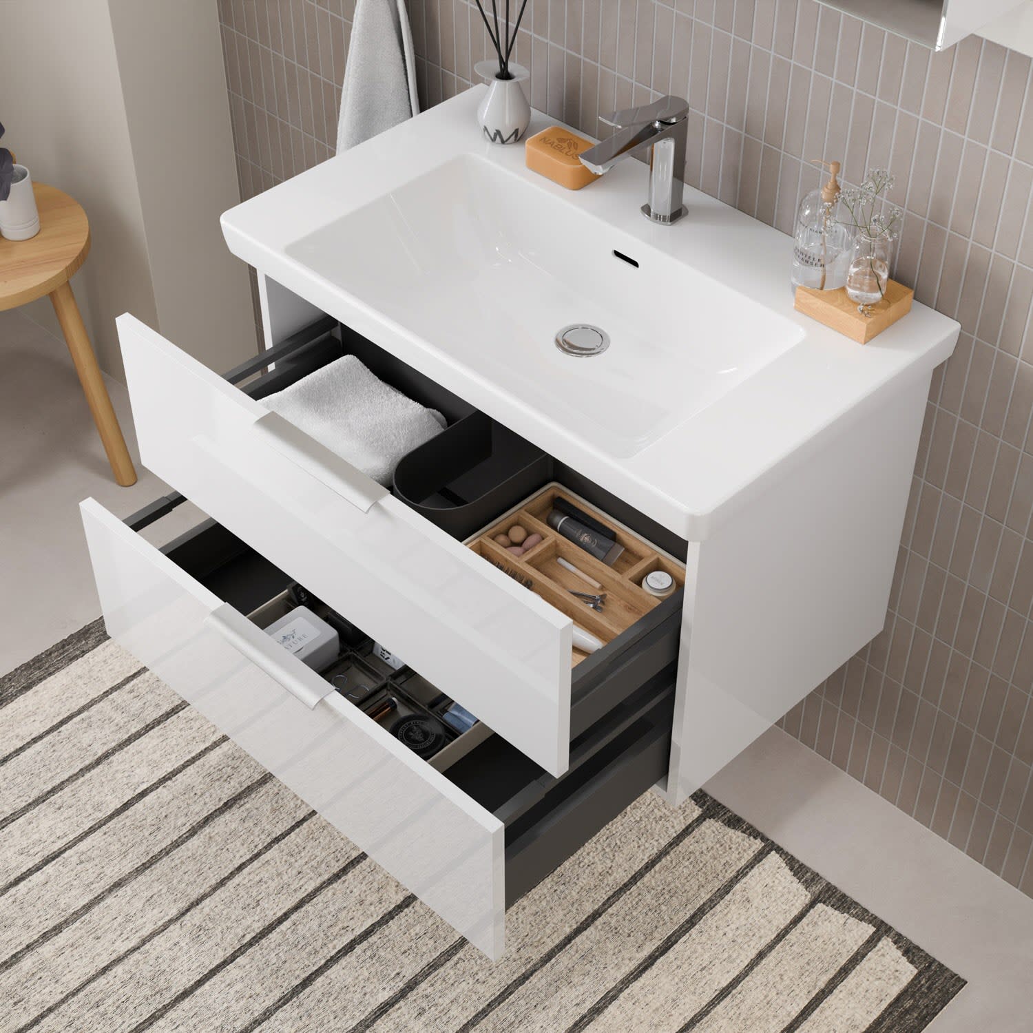 Sie haben bereits einen Waschtisch in Ihrem Bad montiert und wünschen sich mehr Stauraum? Erhältlich in verschiedenen, zeitgemäßen Dekoren und ausgestattet mit modernem, aufgesetztem Griff aus gebürstetem Edelstahl, verbinden die Living 2.0 Waschtischunterschränke zeitloses Design mit maximaler Funktionalität. Je nach Waschplatzbreite sorgen großzügige Auszüge oder Türen für optimalen Stauraum – übersichtlich, griffbereit, stilvoll. Für noch mehr Stauraum ergänzen Sie einen Spiegelschrank oder Hochschrank im passenden Dekor.