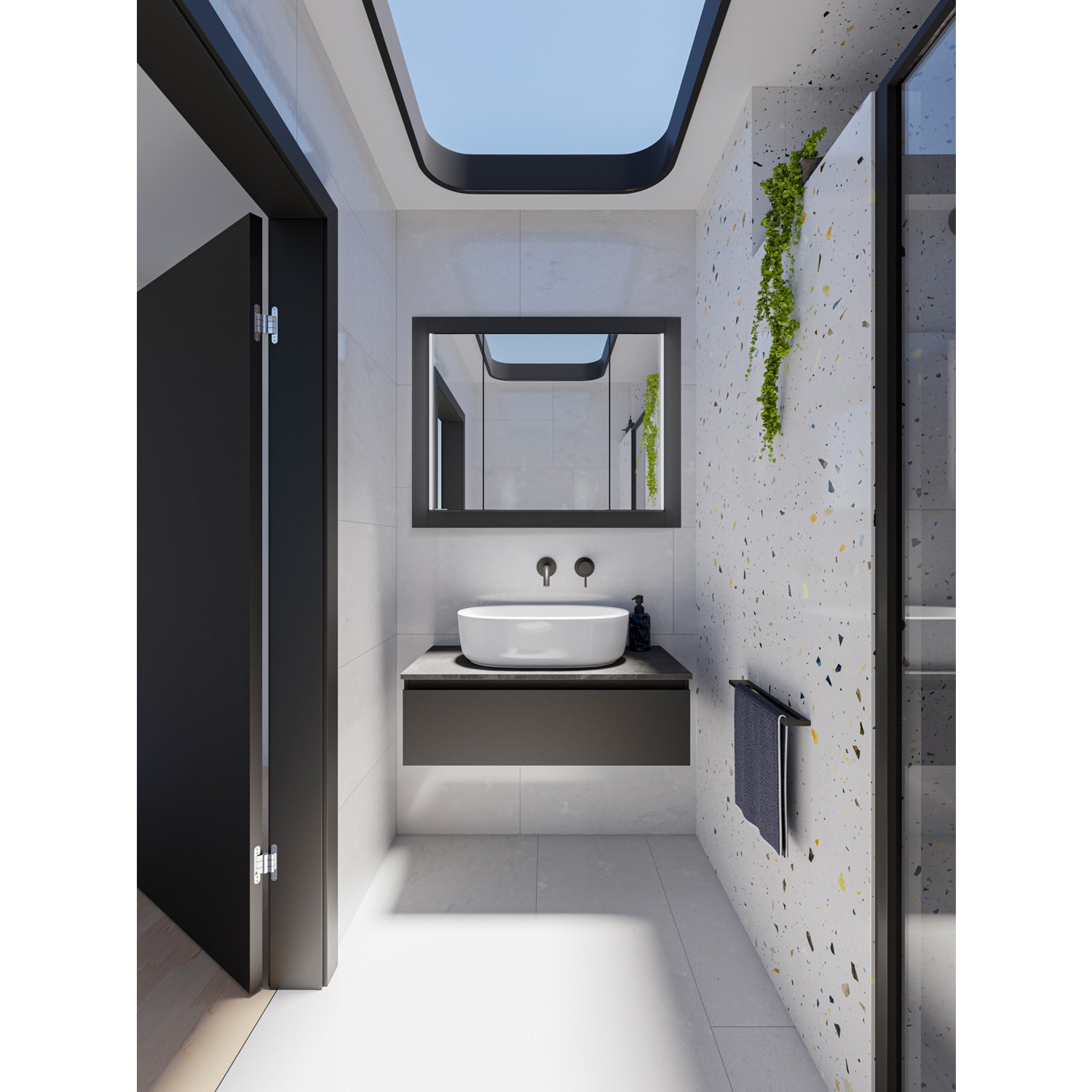 - 1 Schalter und 1 Steckdose unten rechts im Spiegelschrank eingebaut
