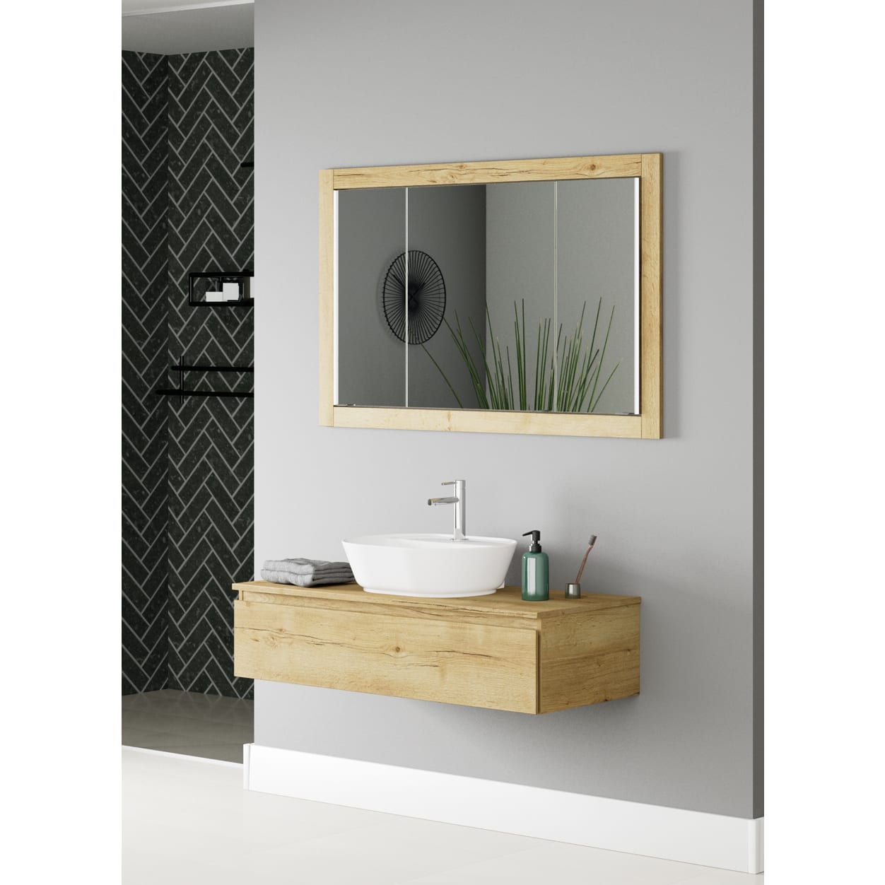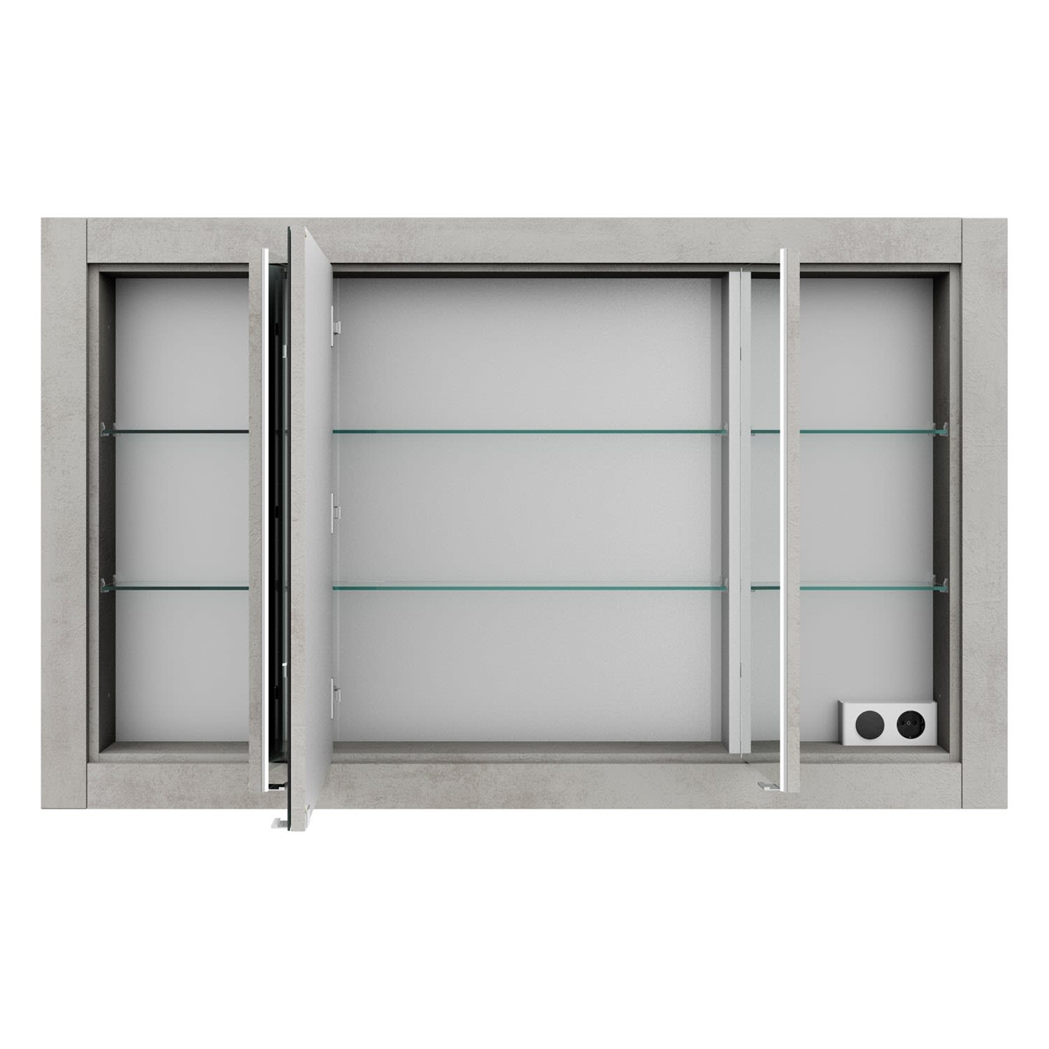 - 1 Schalter und 1 Steckdose unten rechts im Spiegelschrank eingebaut