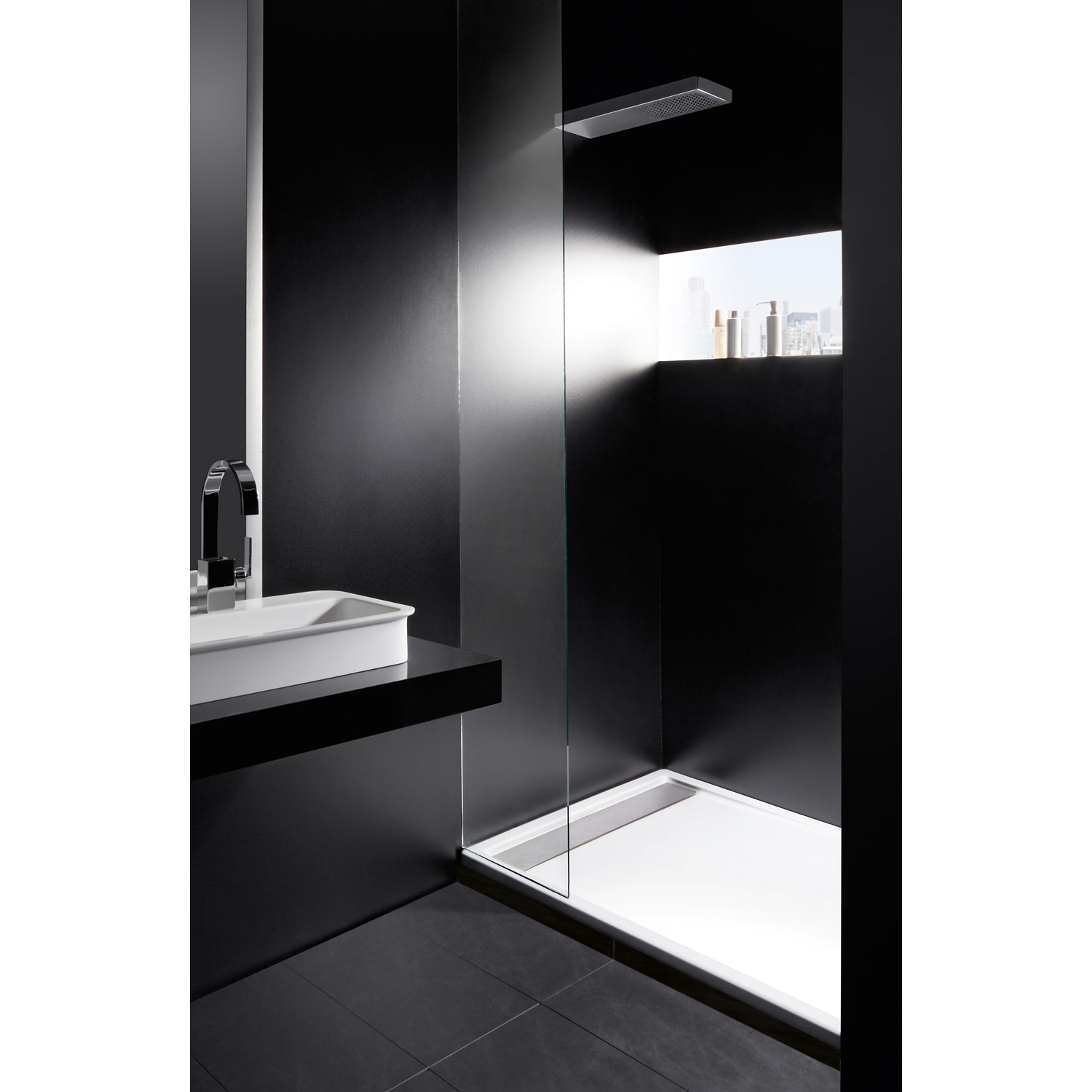 - superflaches modernes Design mit Rinnen-Ablauf in Edelstahl gebürstet