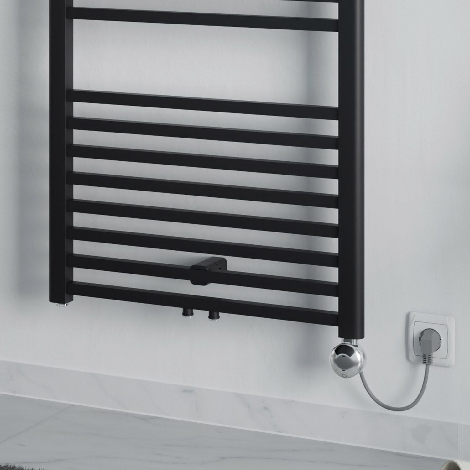 - montagefertig inkl. Heizstab Typ 4 (chrom), Anschlusskabel 1,2 m lang, Thermoflüssigkeit, 1 Befestigungsset (variabler Wandabstand) sowie 1 Stück Verschluss- und 1 Stück Entlüftungsstopfen