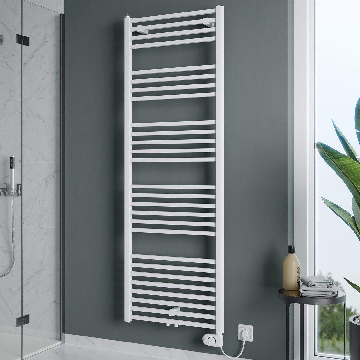 - montagefertig inkl. Heizstab Typ 3 (weiß), Anschlusskabel 1,2 m lang, Thermoflüssigkeit, 1 Befestigungsset (variabler Wandabstand) sowie 1 Stück Verschluss- und 1 Stück Entlüftungsstopfen