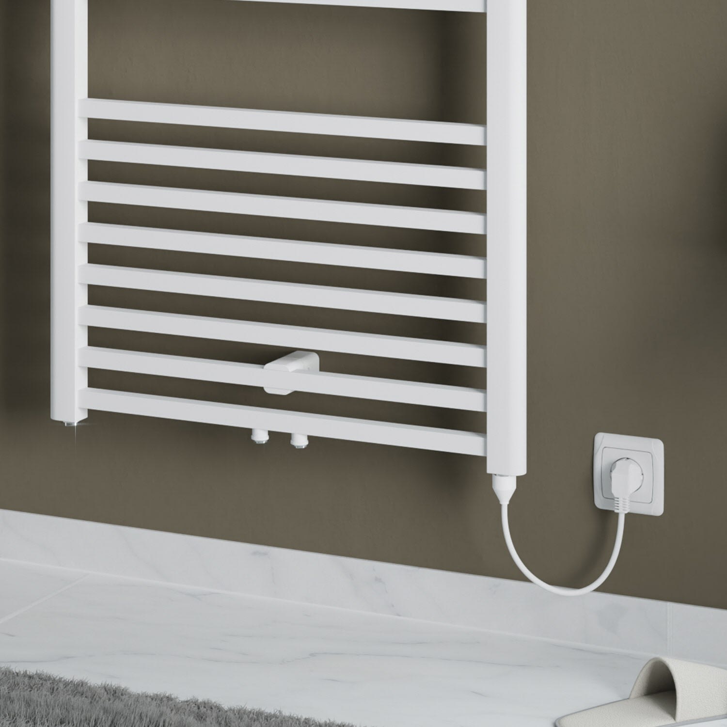 - montagefertig inkl. Heizstab Typ 1 (weiß), Anschlusskabel 1,2 m lang, Thermoflüssigkeit, 1 Befestigungsset (variabler Wandabstand) sowie 1 Stück Verschluss- und 1 Stück Entlüftungsstopfen
