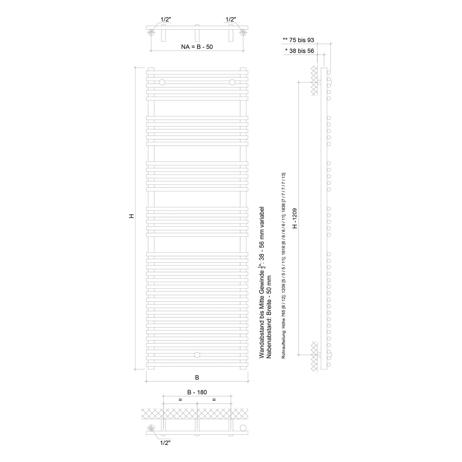 - montagefertig inkl. 1 Befestigungsset (variabler Wandabstand) sowie 1 Stück Verschluss- und 1 Stück Entlüftungsstopfen
