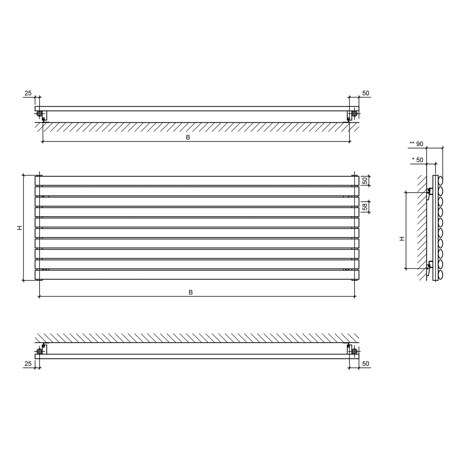 An den Horizontalrohren oben und unten sind jeweils 2 Anschlüsse G ½“ vorhanden. Die Rohrverbindungen sind mittels Widerstandspress-Schweißverfahren (keine sichtbaren Schweißnähte) verbunden. Die Heizkörper werden phosphatiert und in der Standardfarbe RAL 9003 lösungsmittelfrei mit Epoxi–Polyester–Pulver gemäß DIN 55900 elektrostatisch beschichtet und eingebrannt.
