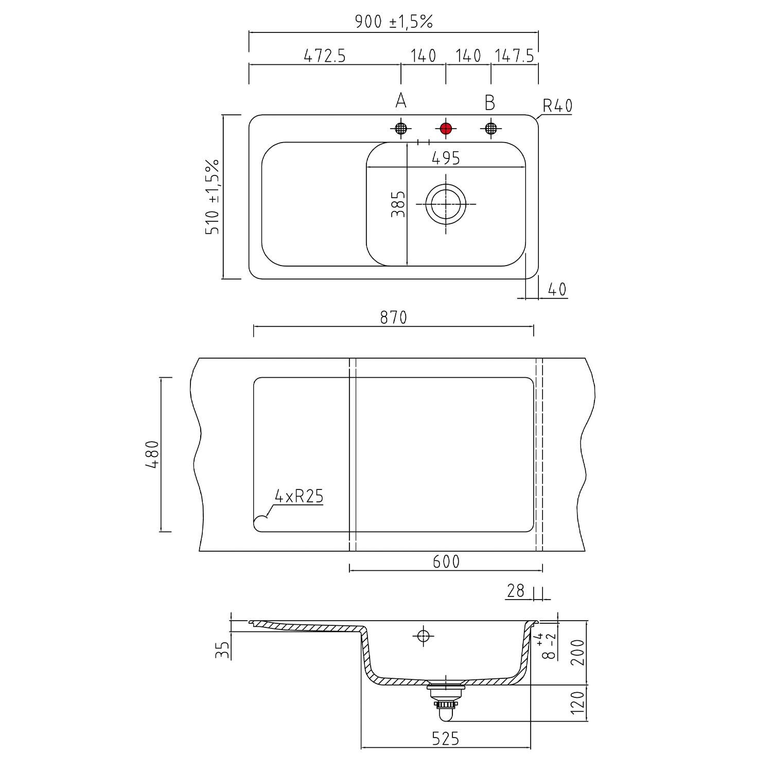 - Ausschnittmaß in der Arbeitsplatte: 87 x 48 cm (BxT)