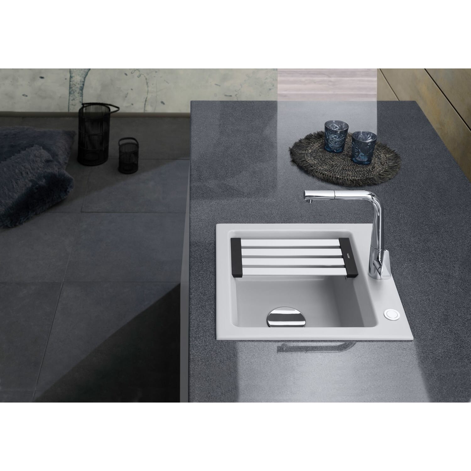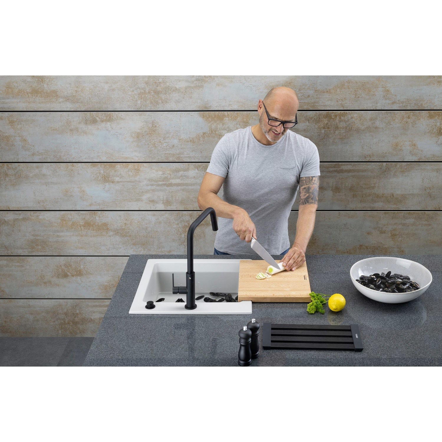 Die neue KARA 51 ist eine stilistisch und praktisch großzügige Einbauspüle: Die angeschrägten Beckenkanten nehmen die Medio-Matte als zweite Funktionsebene im Becken auf.