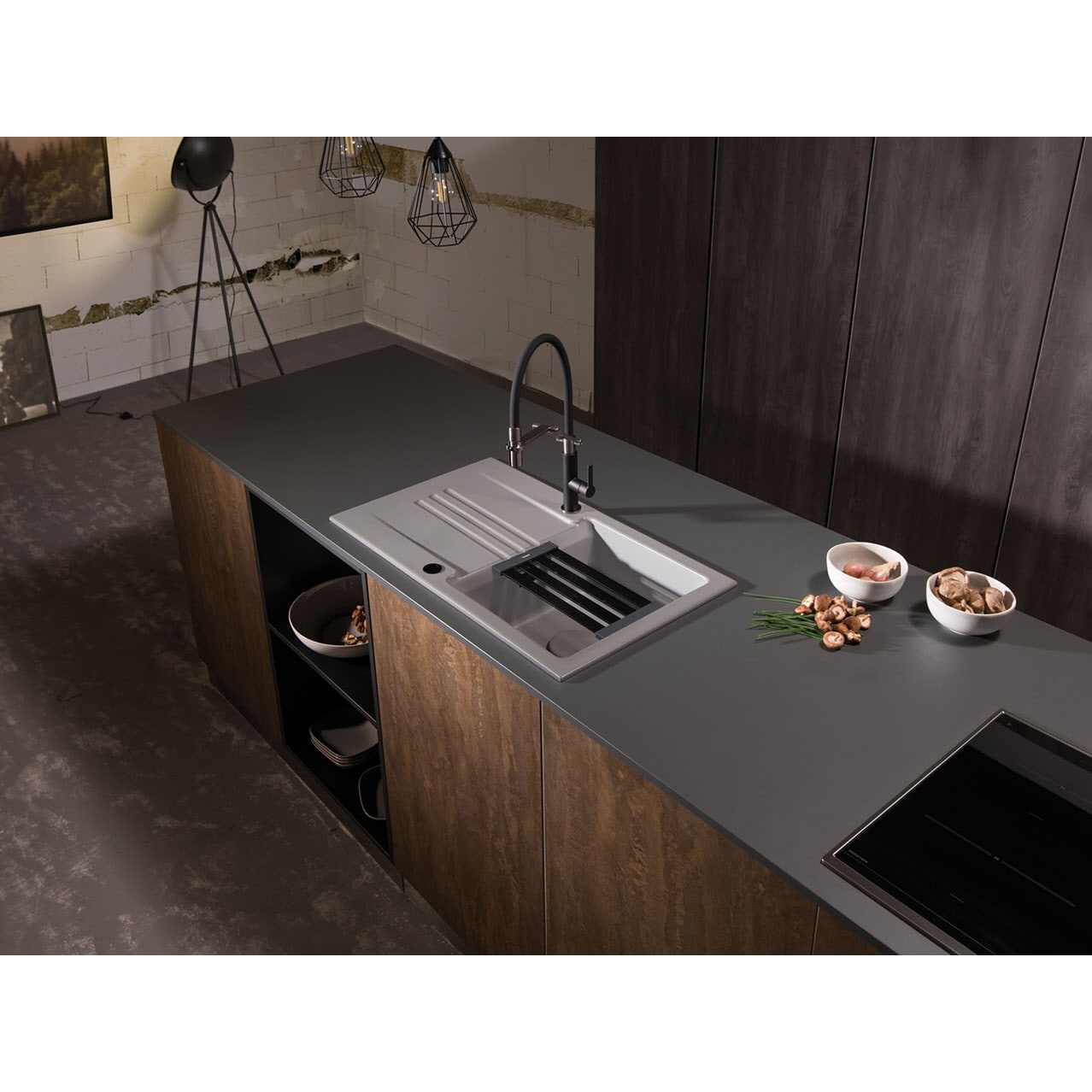 Die neue KARA 85 ist eine stilistisch und praktisch großzügige Einbauspüle mit allem Drum und Dran: Vor allem einem glatten Arbeitsbereich in der Abtropffläche. Die angeschrägten Beckenkanten nehmen die MedioMatte als zweite Funktionsebene im Becken auf. Mittig platziert entsteht dabei eine optische Fortsetzung der markanten Rillen auf der praktischen Abtropftfläche.