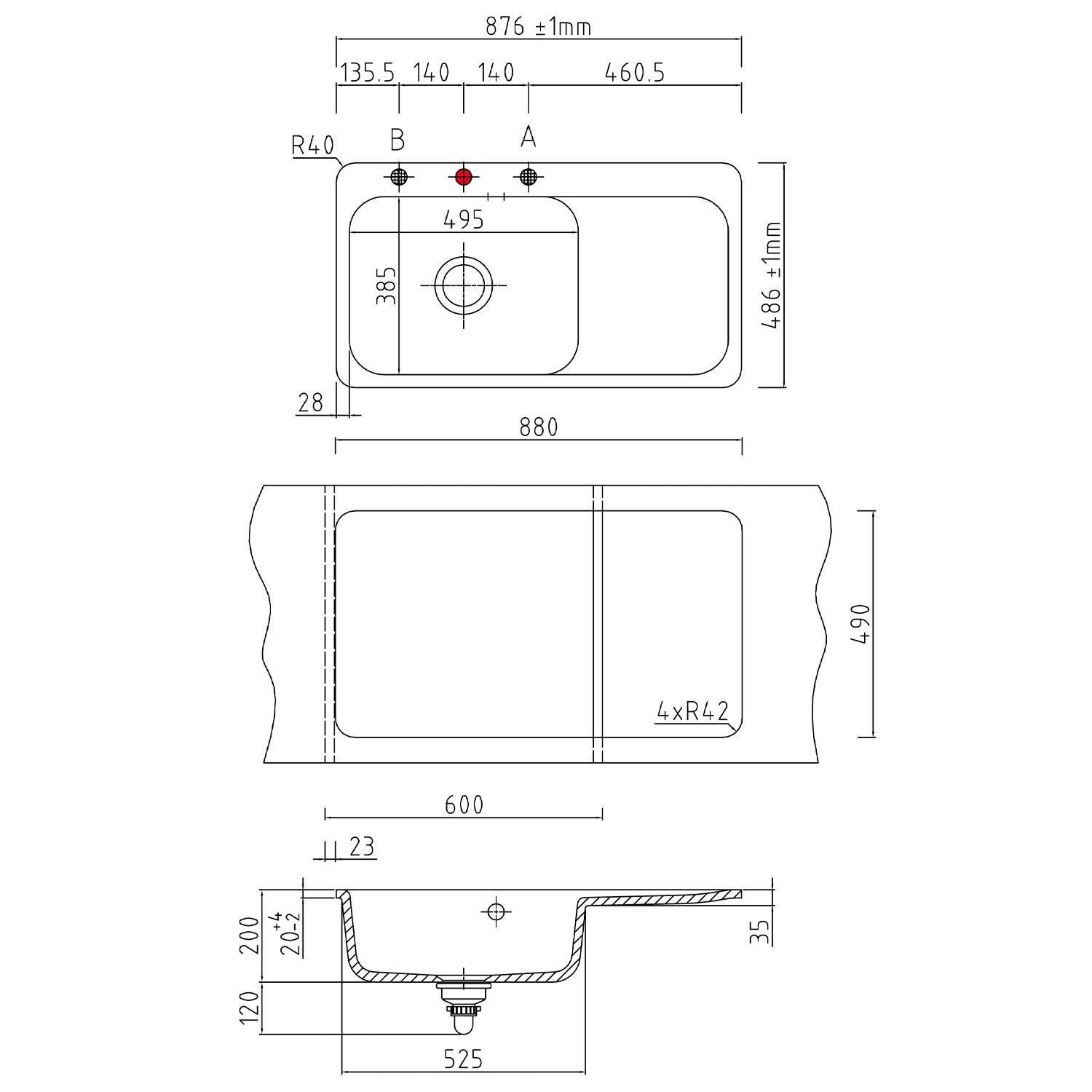 - Ausschnittmaß in der Arbeitsplatte: 88 x 49 cm (BxT)